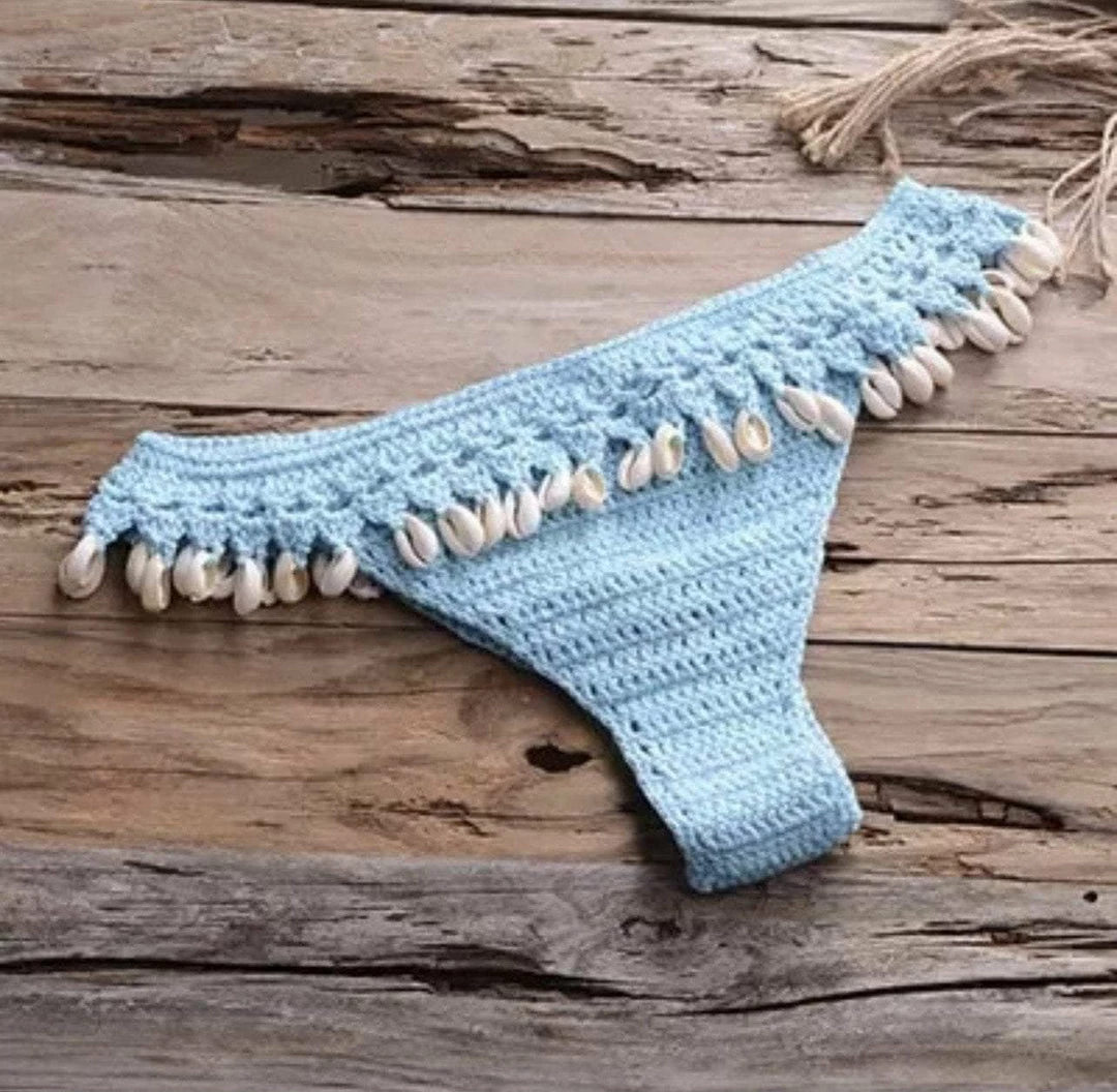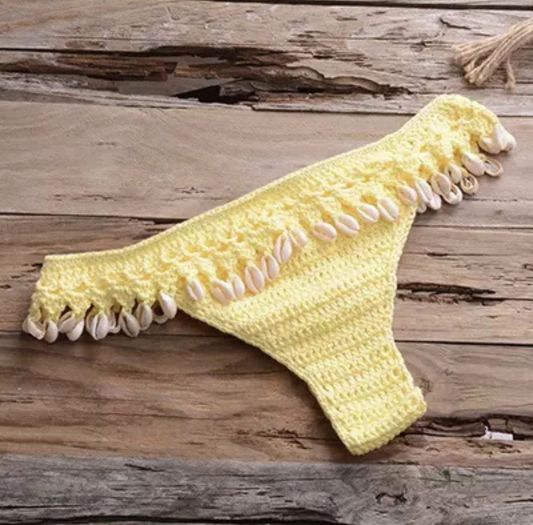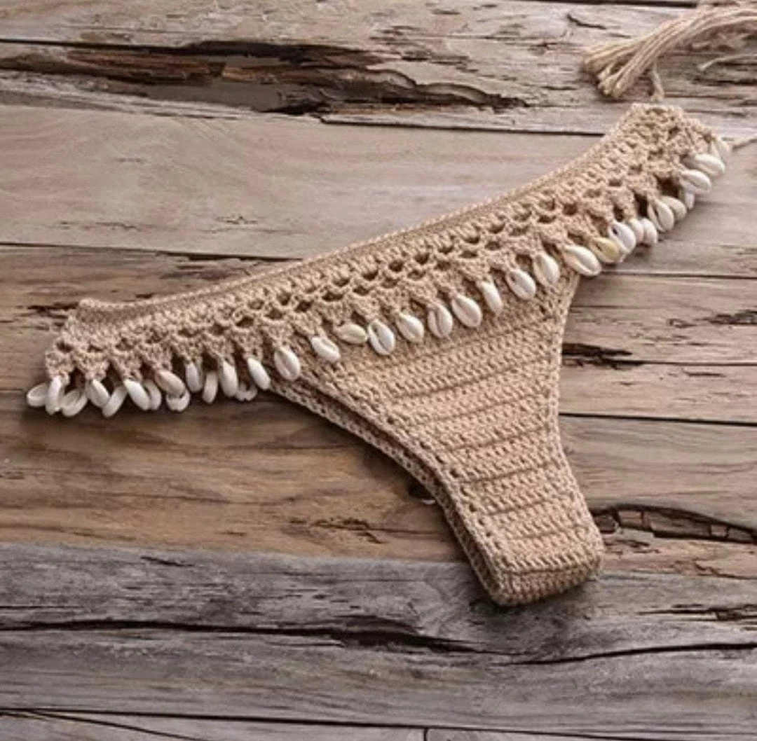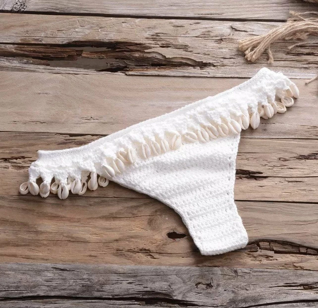 Turn into a total beach babe with this stunning two piece bikini. The set includes a handmade crotchet top with a low back and a matching bikini thong with attached seashell tassels.