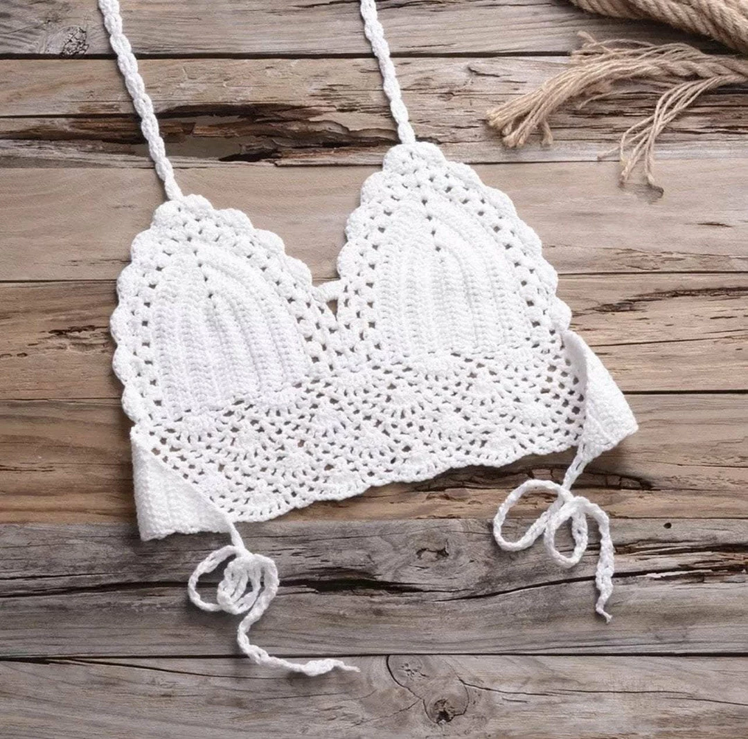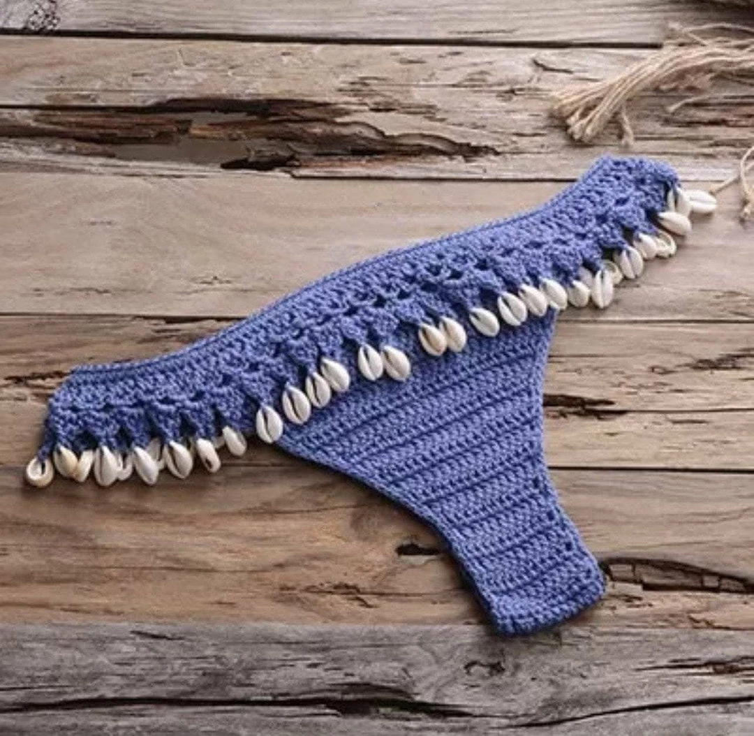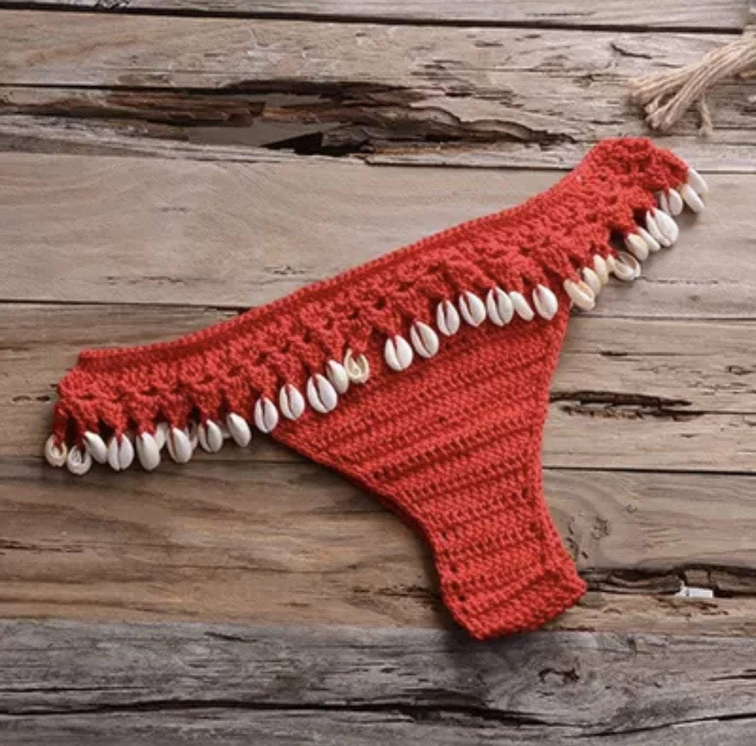 Turn into a total beach babe with this stunning two piece bikini. The set includes a handmade crotchet top with a low back and a matching bikini thong with attached seashell tassels.