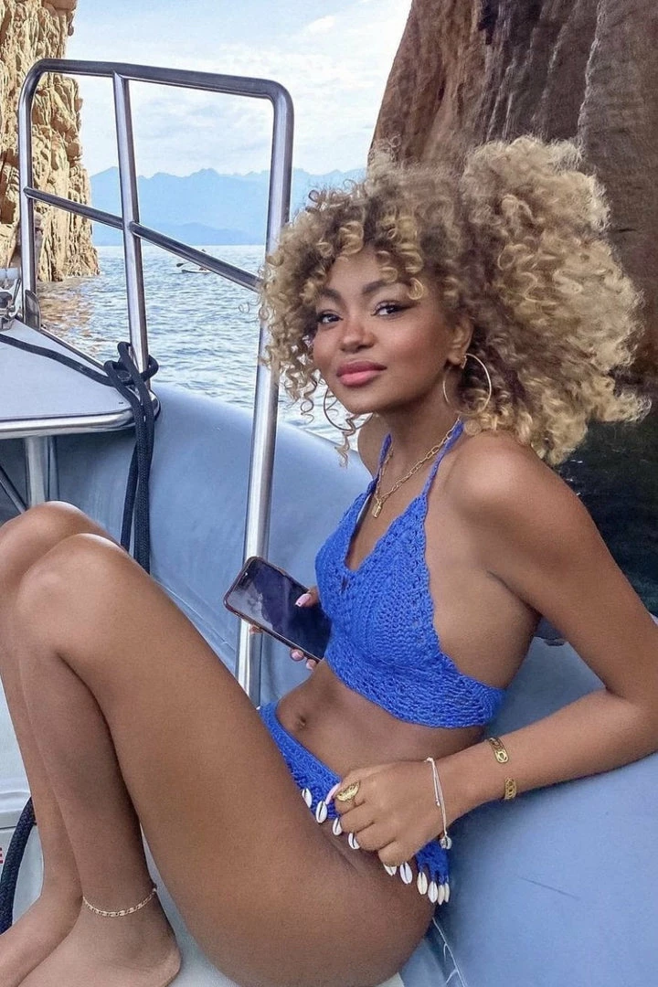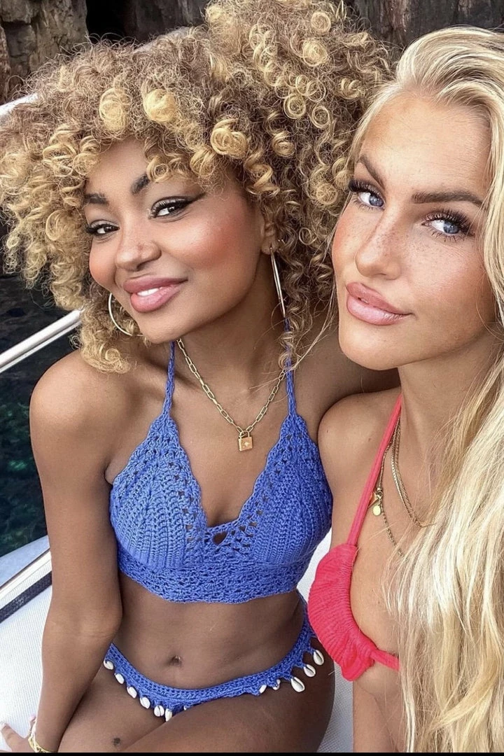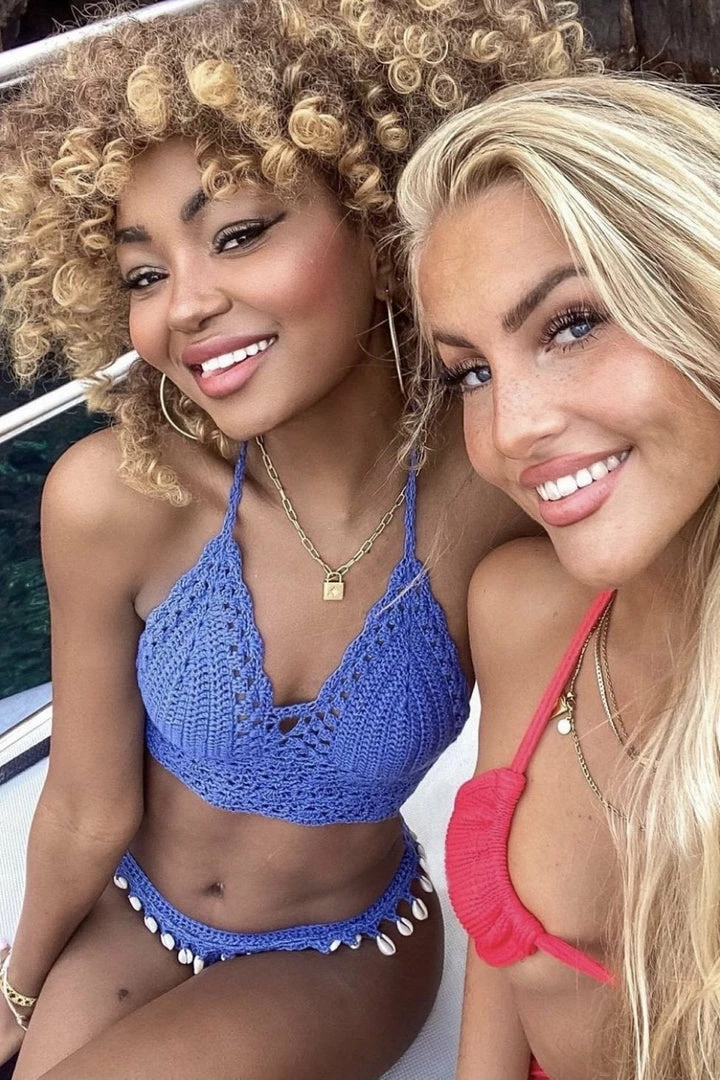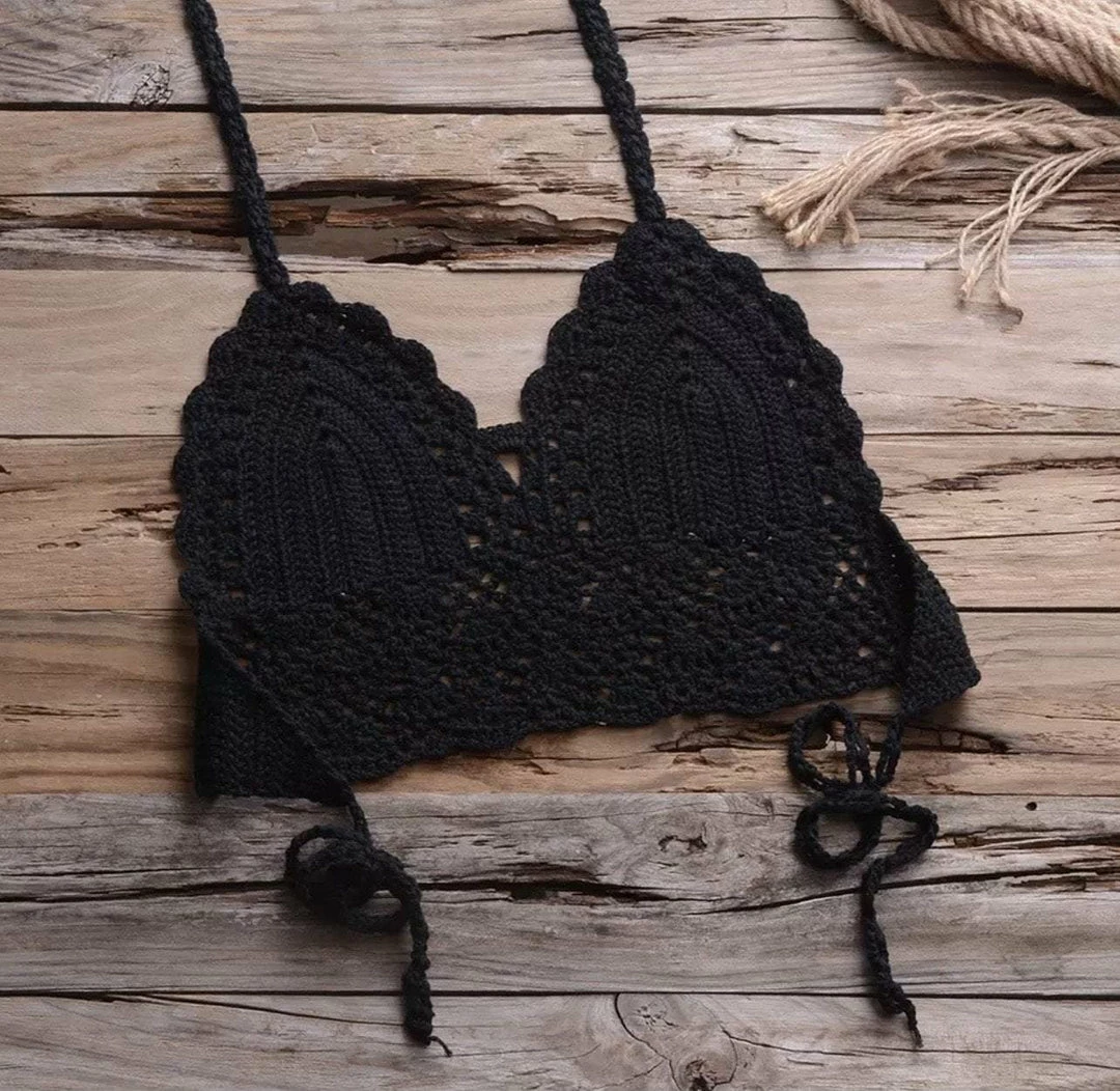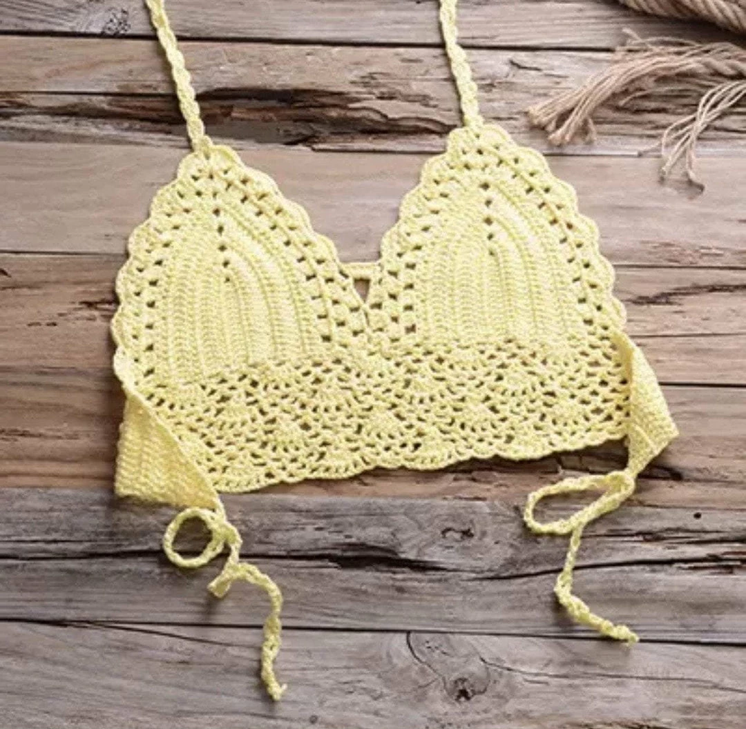 Turn into a total beach babe with this stunning two piece bikini. The set includes a handmade crotchet top with a low back and a matching bikini thong with attached seashell tassels.