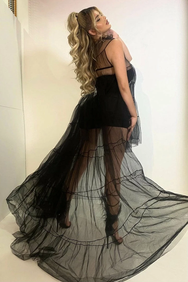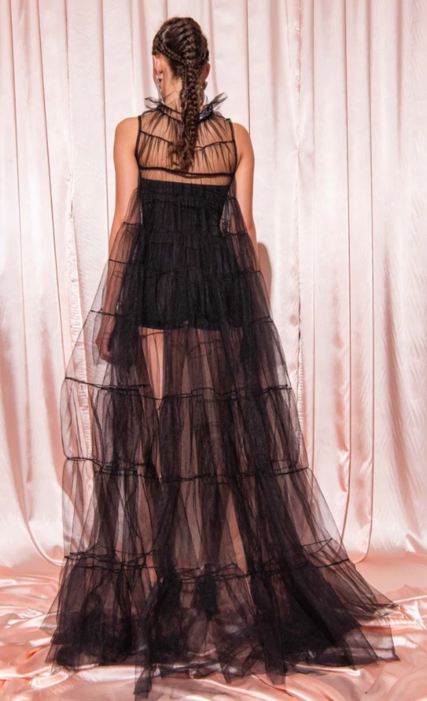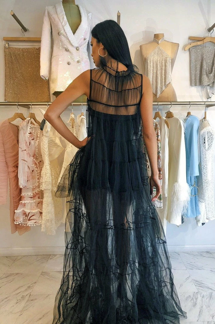 Serve some major drama at your next event in this amazing piece. Featuring a sheer tulle material, high neckline, high-low length, and sleeveless style. Pair with a sleek high pony and stilettos!