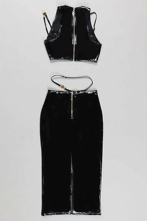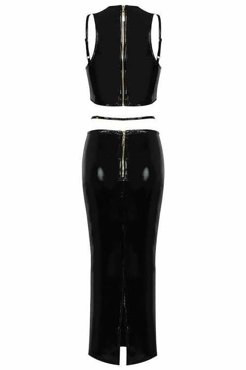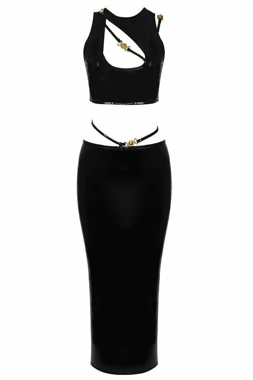 Style this sleek set for sexy night out! Featuring a pleather sleeveless, gold strappy crop top with a matching strappy long skirt. Slick back your hair with a smokey eye to go full catwoman this weekend.