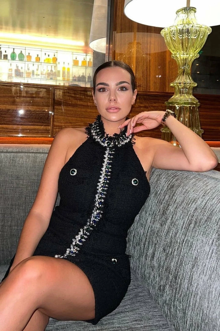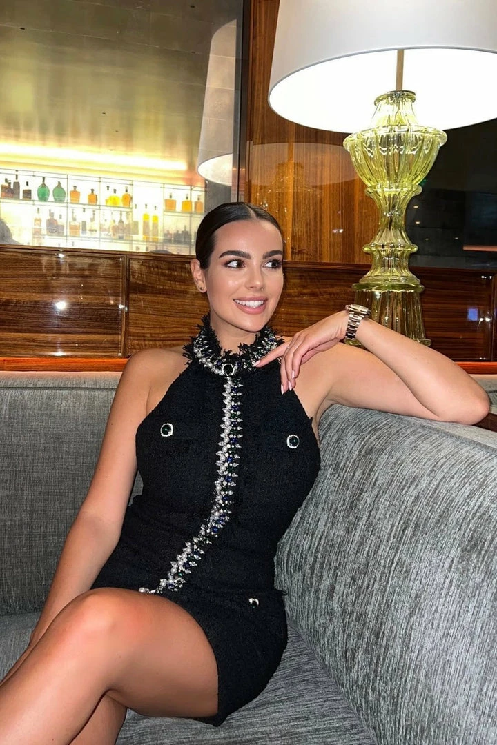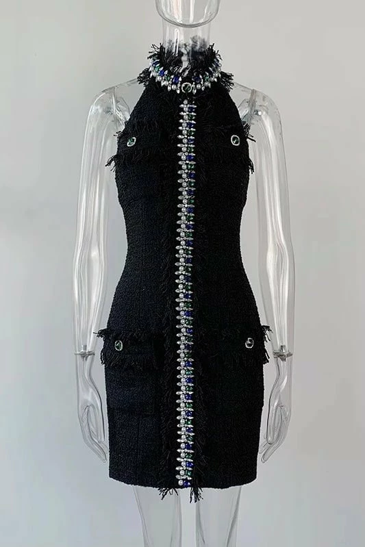 Look like an absolute doll in this totally chic mini dress! Featuring a tweed material, rhinestone detailing, a high neckline, and a low cut back. Pair with ankle strap heels and a mini bag for a daytime outing with the girls!