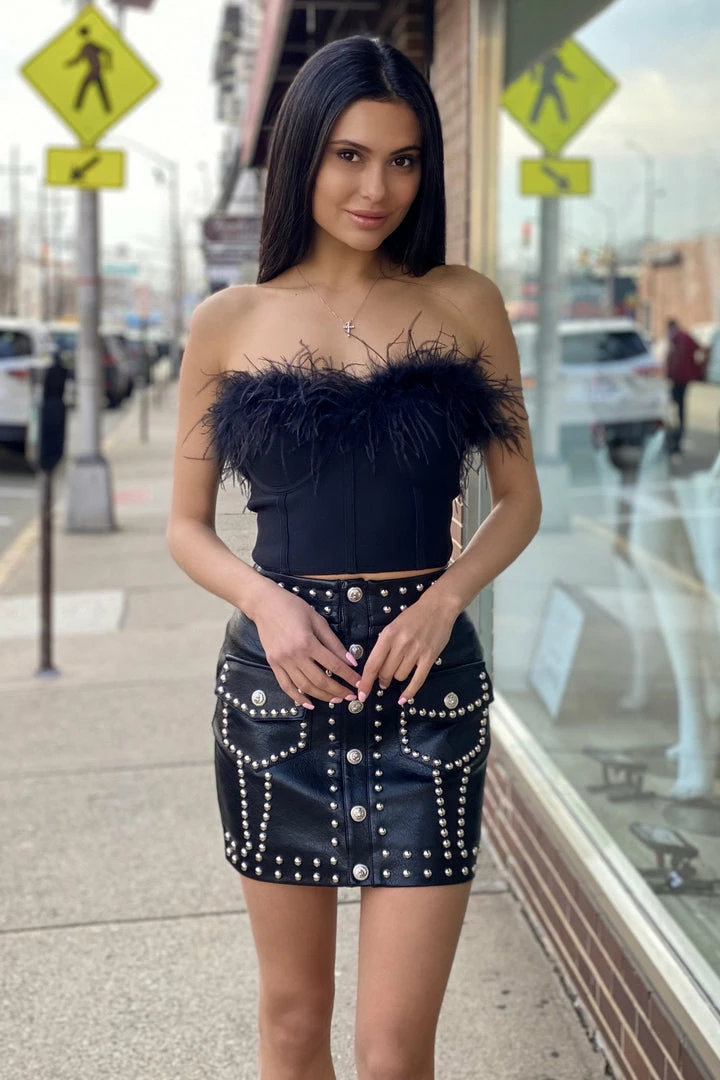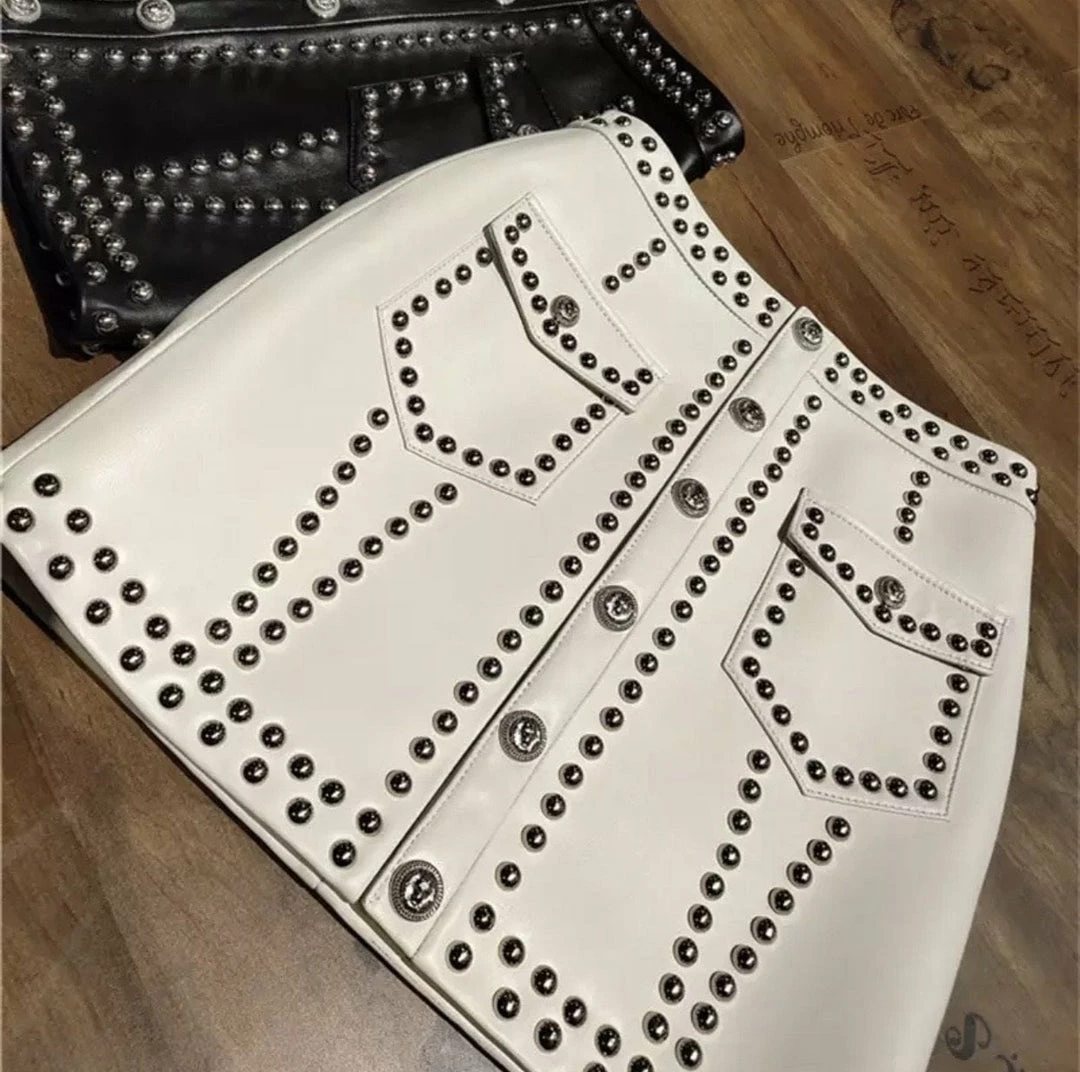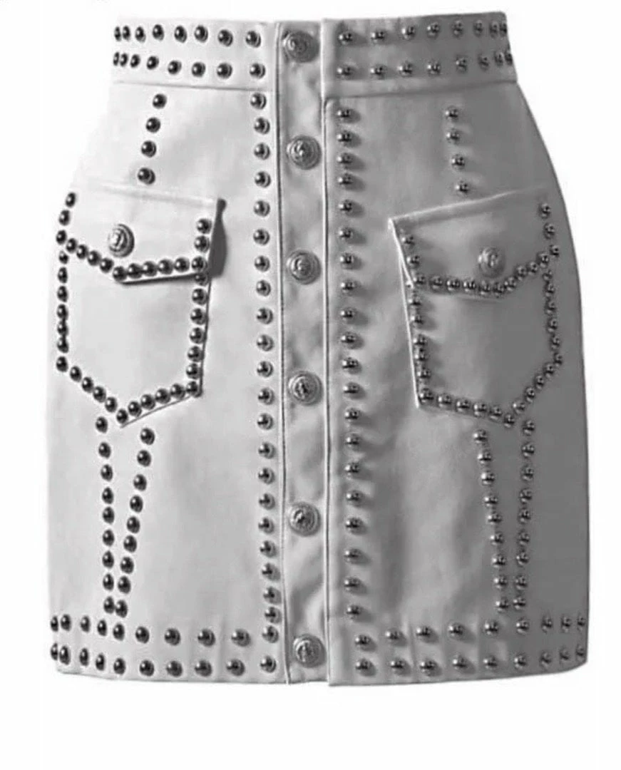 This skirt will take you from day to night dolls! Featuring a leather material, high-waisted fit, silver embellishments, pockets, and mini length. Pair with a tee and sneakers for a chic casual look, or a bodysuit and heels for date night!