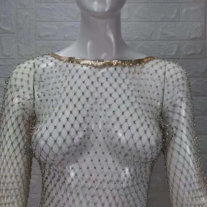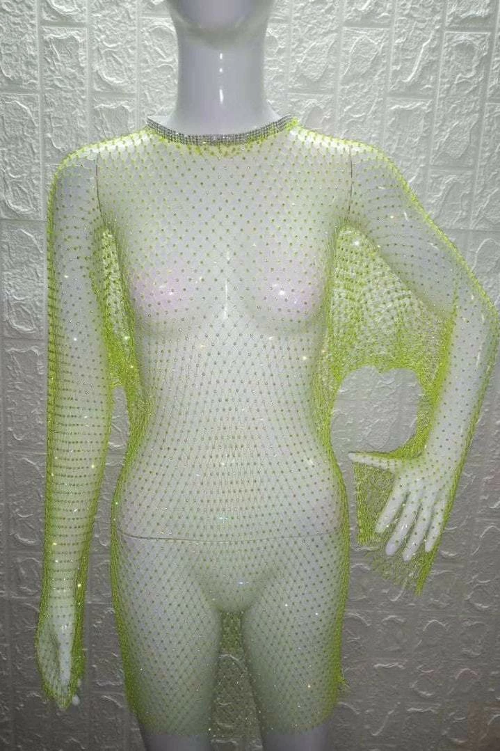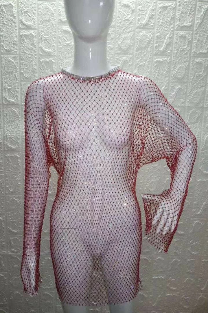 This sexy mini features a fishnet style with diamond decoration, long sleeves, and a rhinestone collar. Team this with a bikini for hot beach bar look or pair over a slip for a dazzling night out!