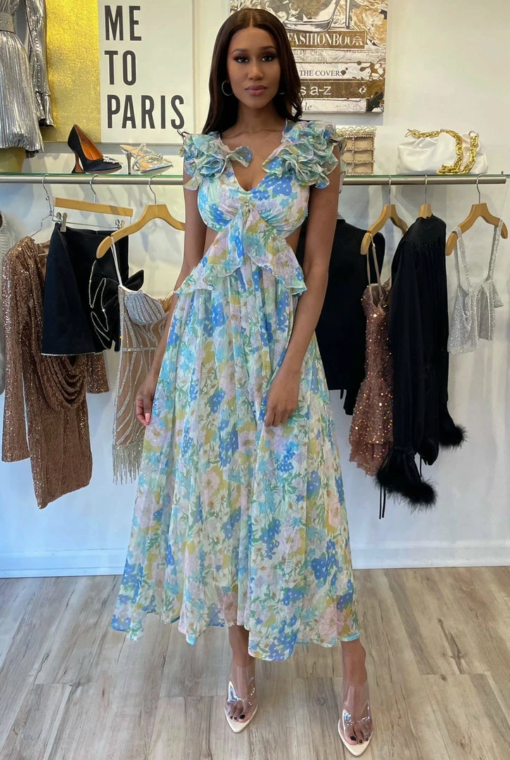 Look absolutely elegant and feminine in the ‘Odonna’ maxi. Featuring a floral printed material, ruffle details, cut-outs, and a floor length. Pair with a mini handbag and tousled beach waves for a great summertime look.
