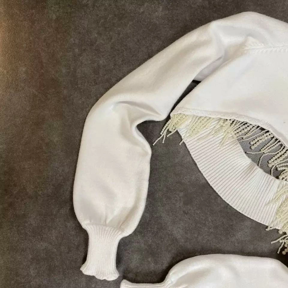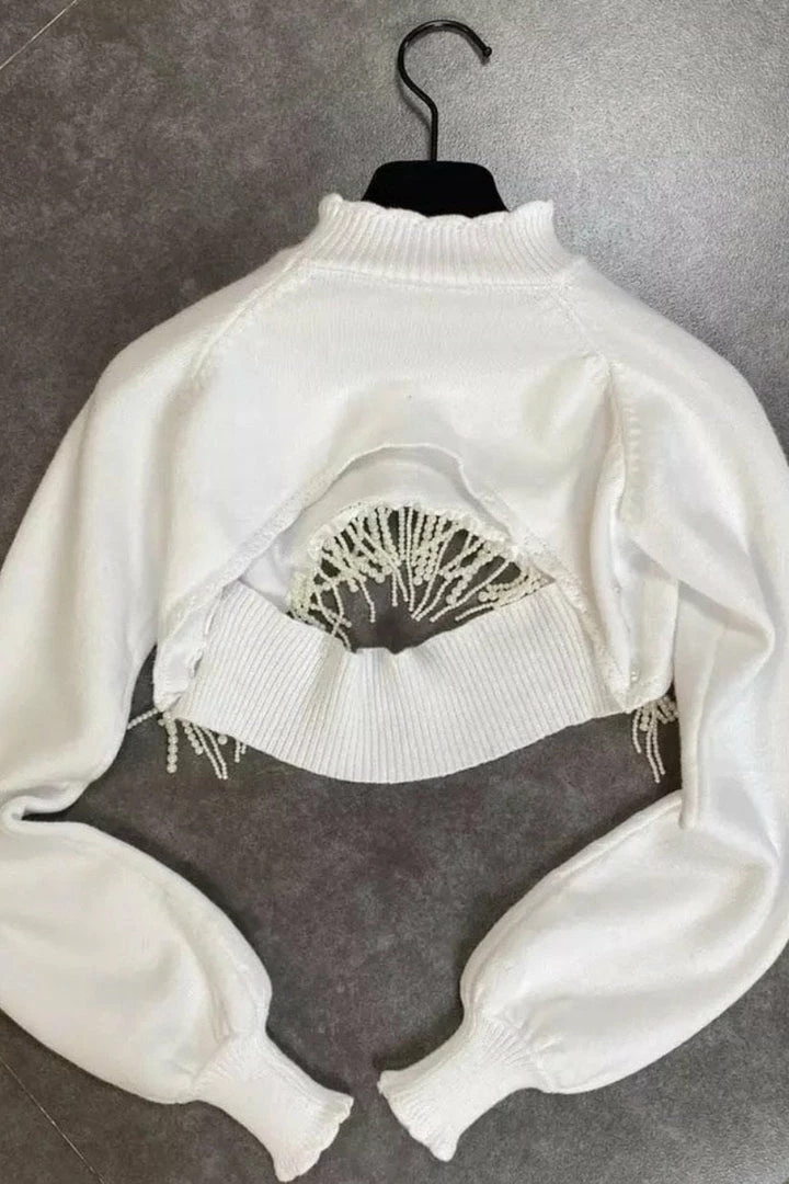 Get ready to steal all the stares in this crop top. Featuring a mock neck style with long sleeves, an extreme cropped length, and beaded tassels. Team this with a bralette, jeans, and heels to amp up your weekend look.