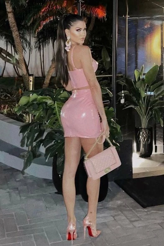 Come on Barbie let’s go party! This totally cute two piece features a pleather crop top with gold clasp details and a matching mini skirt. Style with pink strappy heels and a little bag for a night out you won’t forget.
