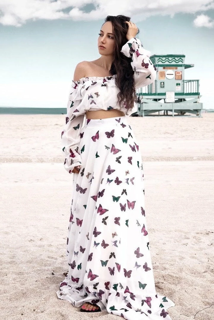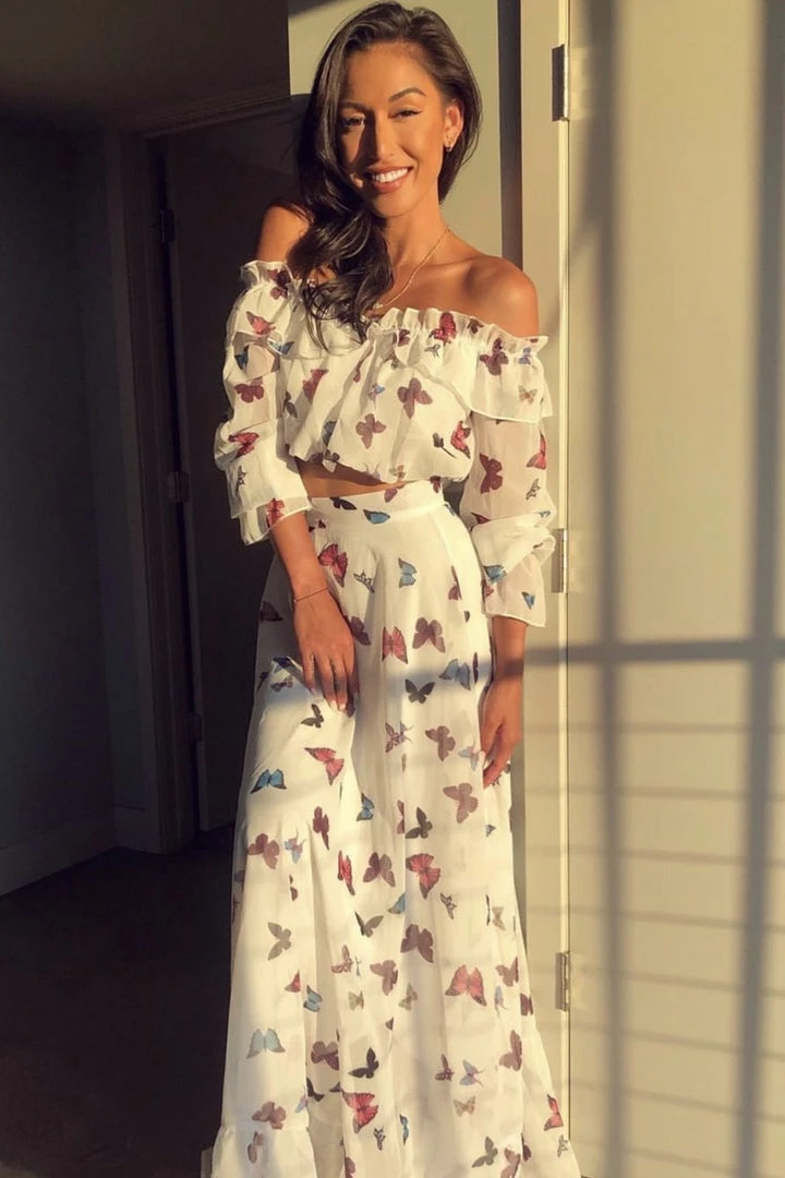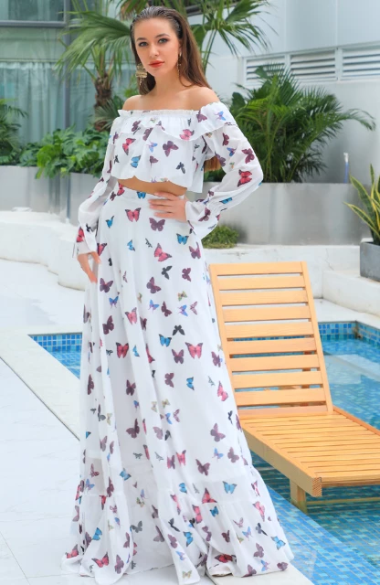This Jessica Bara off shoulder two piece is made of a beautiful butterfly print with an off shoulder crop top and a long full skirt. This is the next it piece of the season.