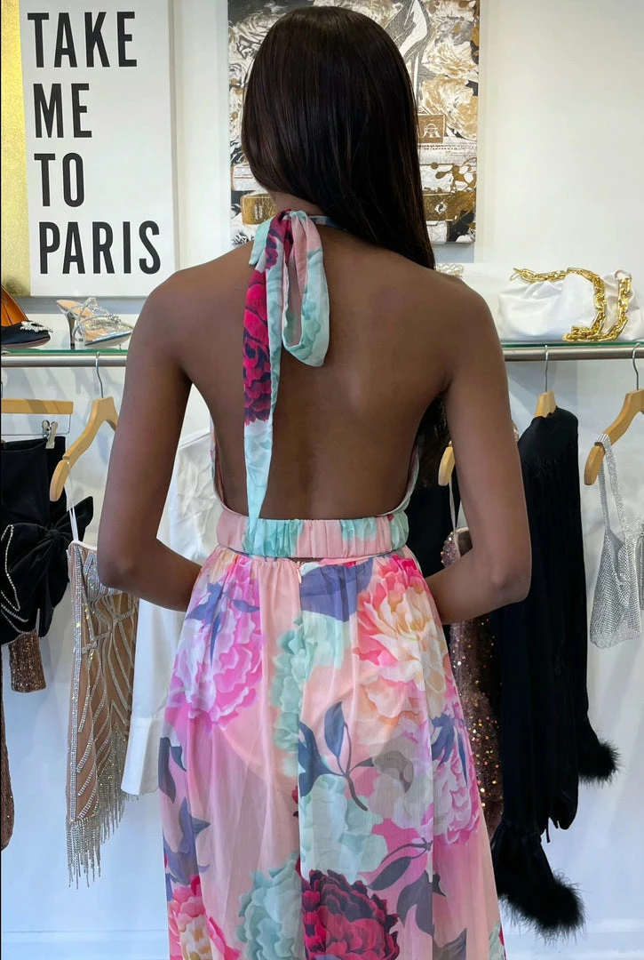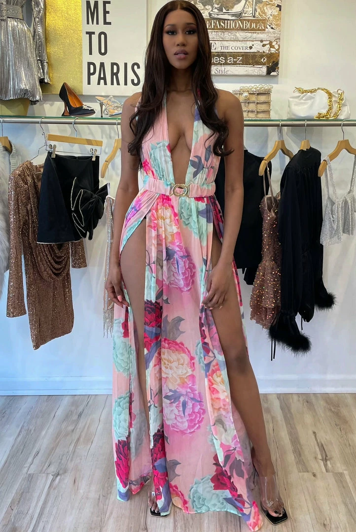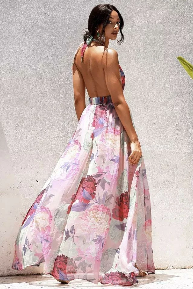 Feel like a beach beauty in this maxi featuring a plunging v neck, halter neck tie, floral print, double split leg slits, and an open back. Grab your beach bag and head on vacation!