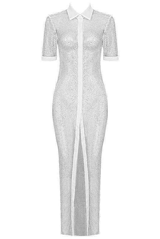 Shine by the poolside in this gorgeous maxi! Featuring a short sleeve, button down maxi cover up with a see-through mesh sequin design. Style over a white bikini and a floppy hat for a vacation look we’re loving!