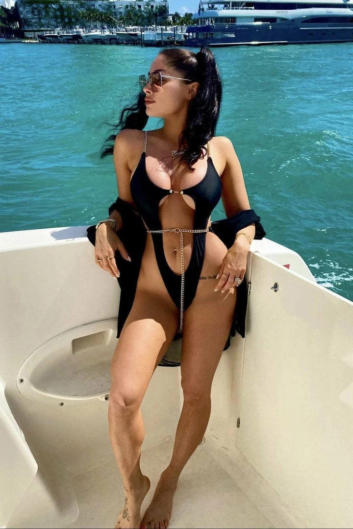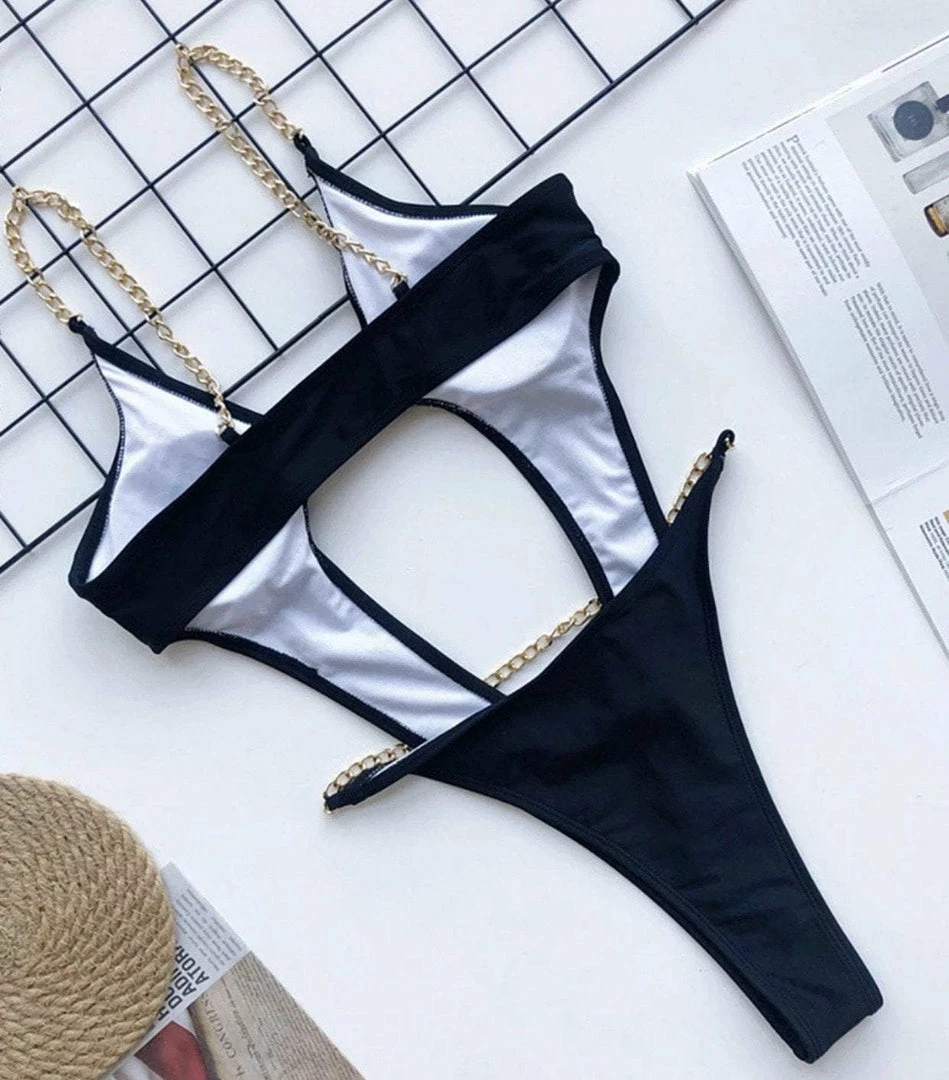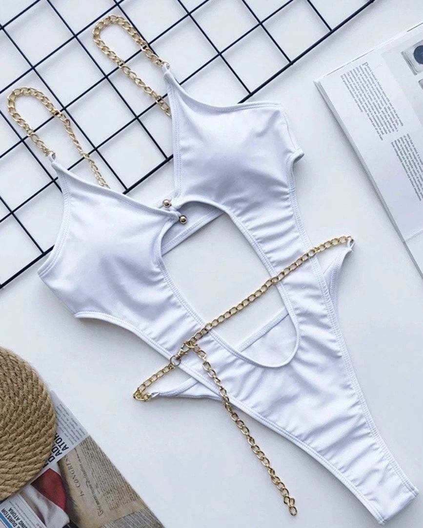 Show off your summer body in this high cut one piece bathing suit. With a deep v neck, stomach and back cut outs, chain straps, chain belt, and a front metal clasp fastening.