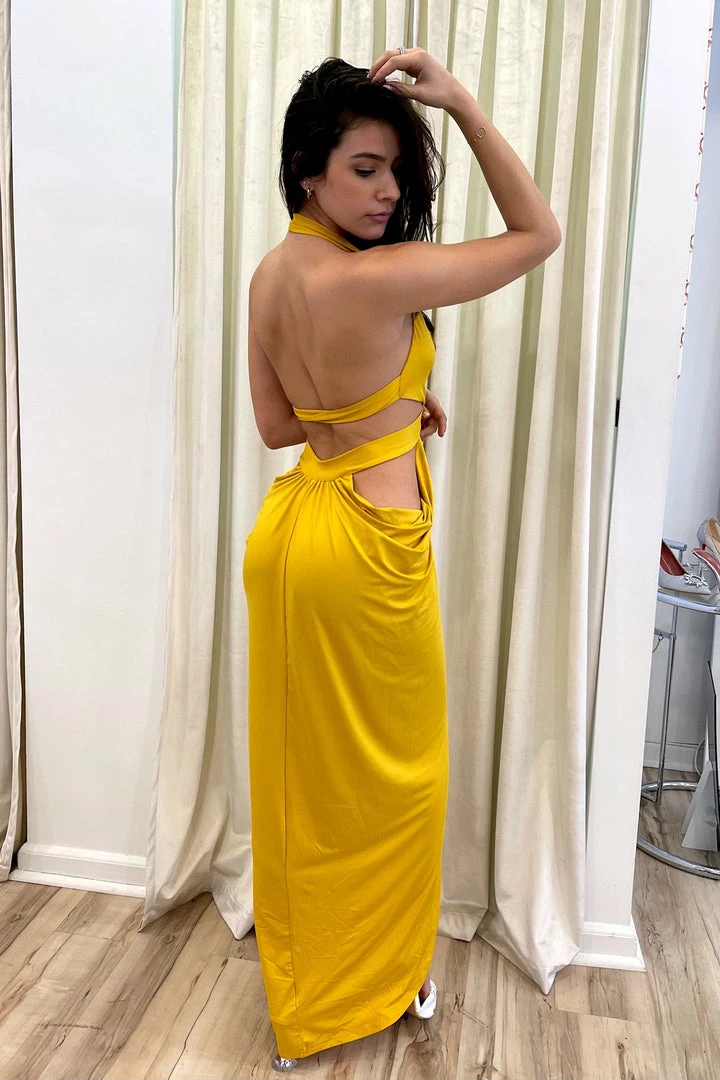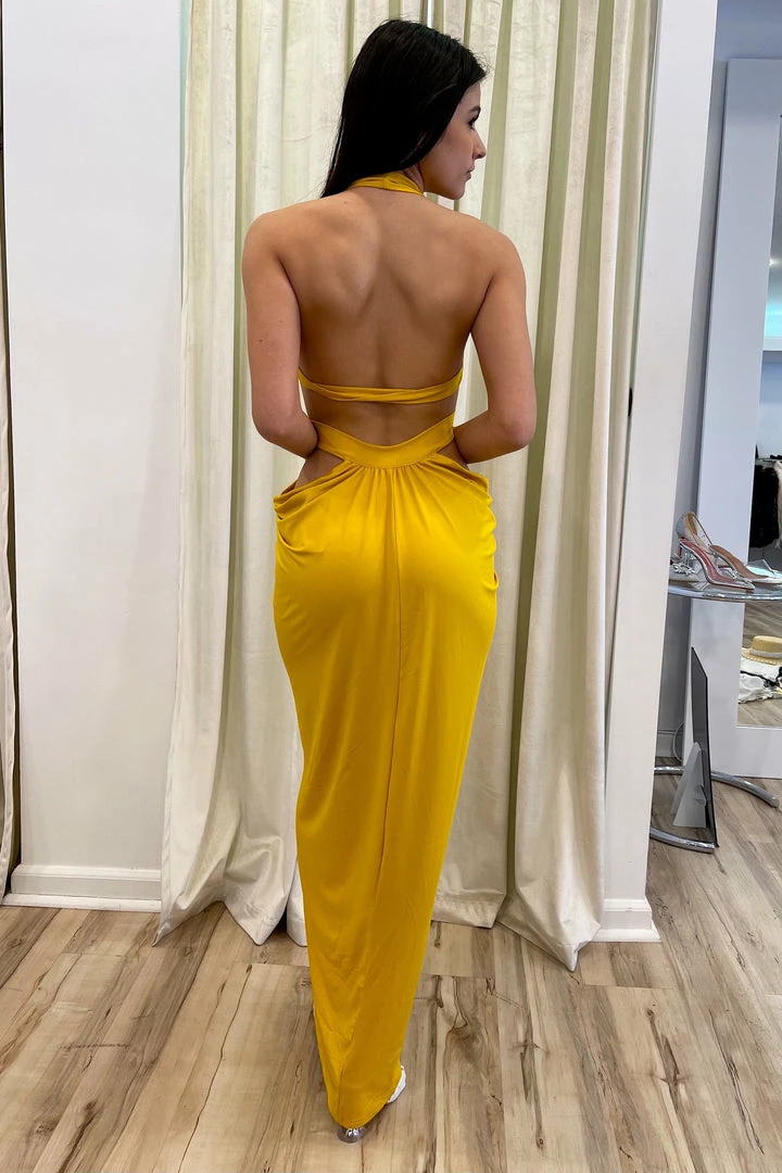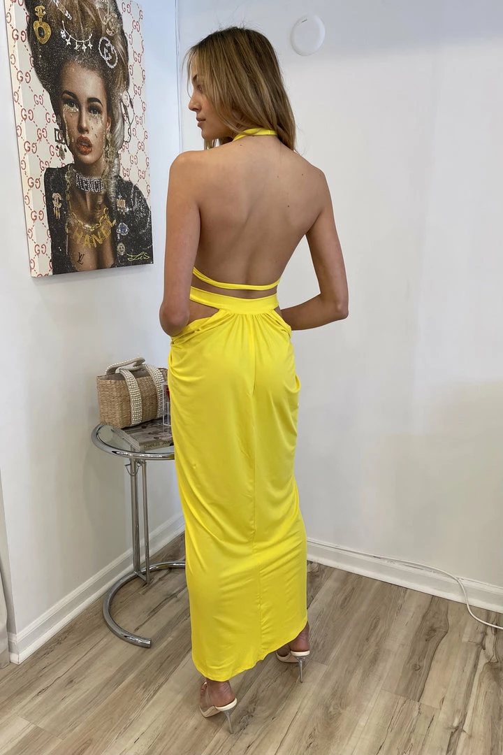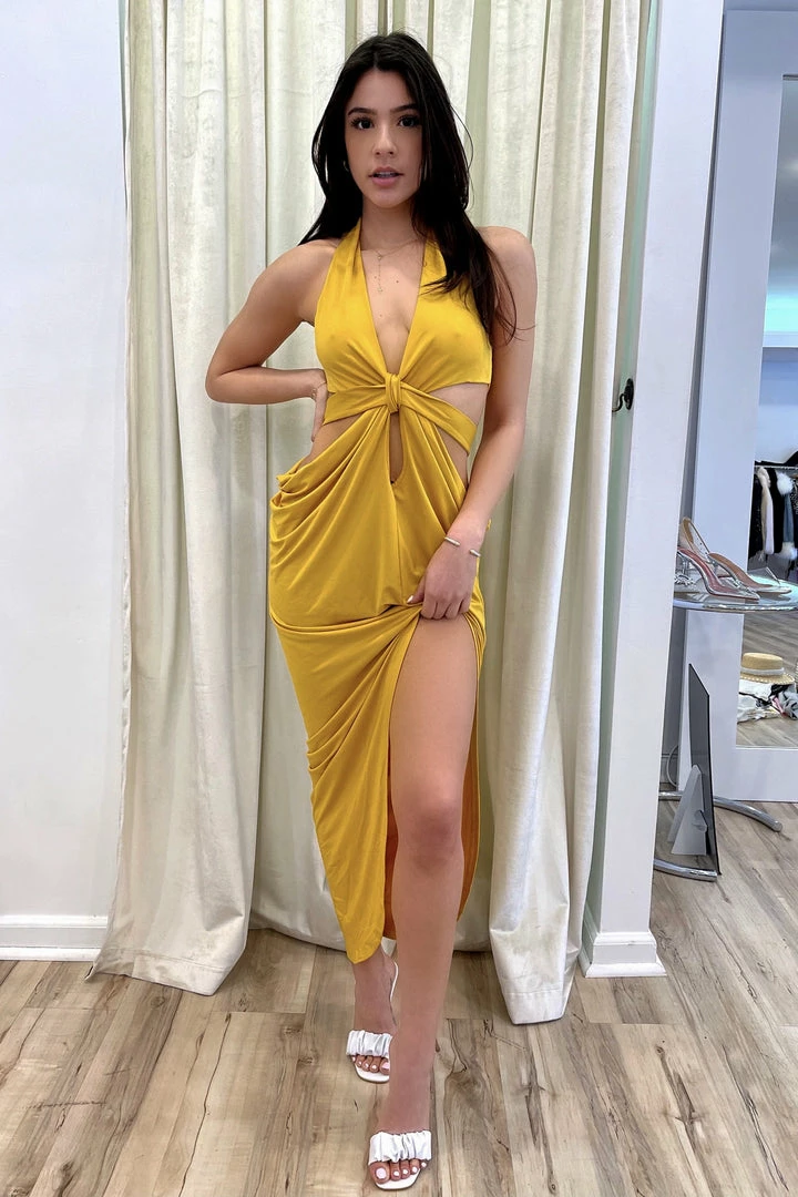This draping maxi dress features a halter neck with knot detailing, cut outs on the sides and back, and a long leg slit in the front. Whether for a beach vacation party or a date night out, this dress will make you irresistible!
