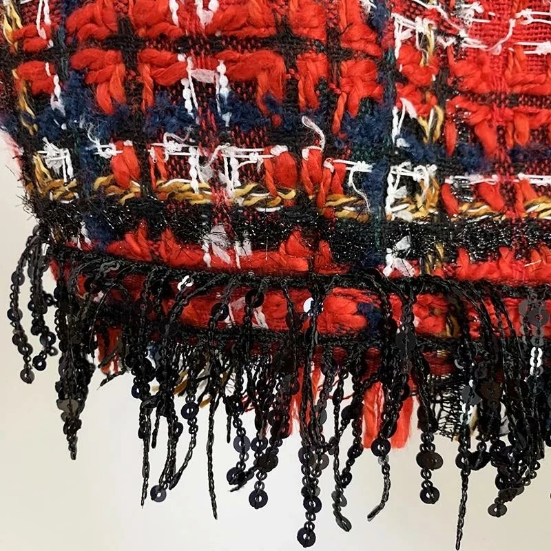 Nail all of the trends this season in this gorgeous top! Featuring a tweed material, plaid print, gold chain, fringe trim, and a cropped length. Pair with the matching ‘Tinsley’ skirt for the chicest look!
