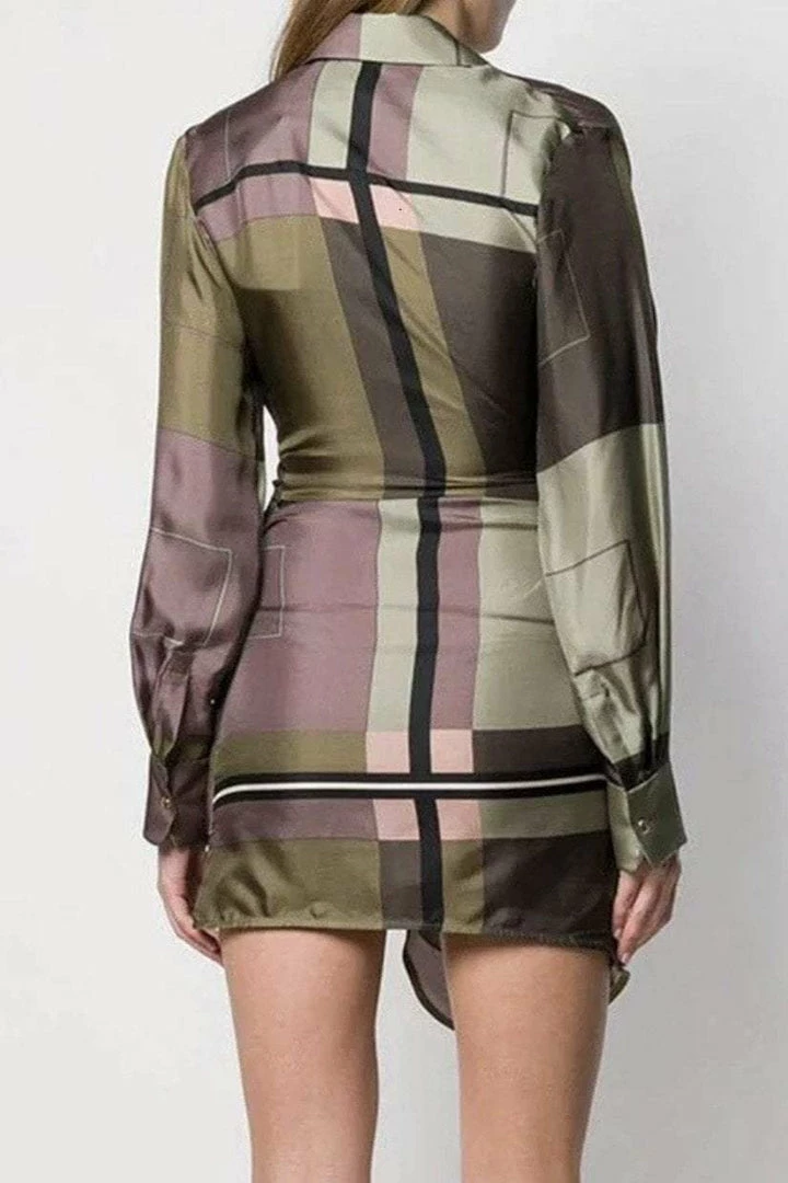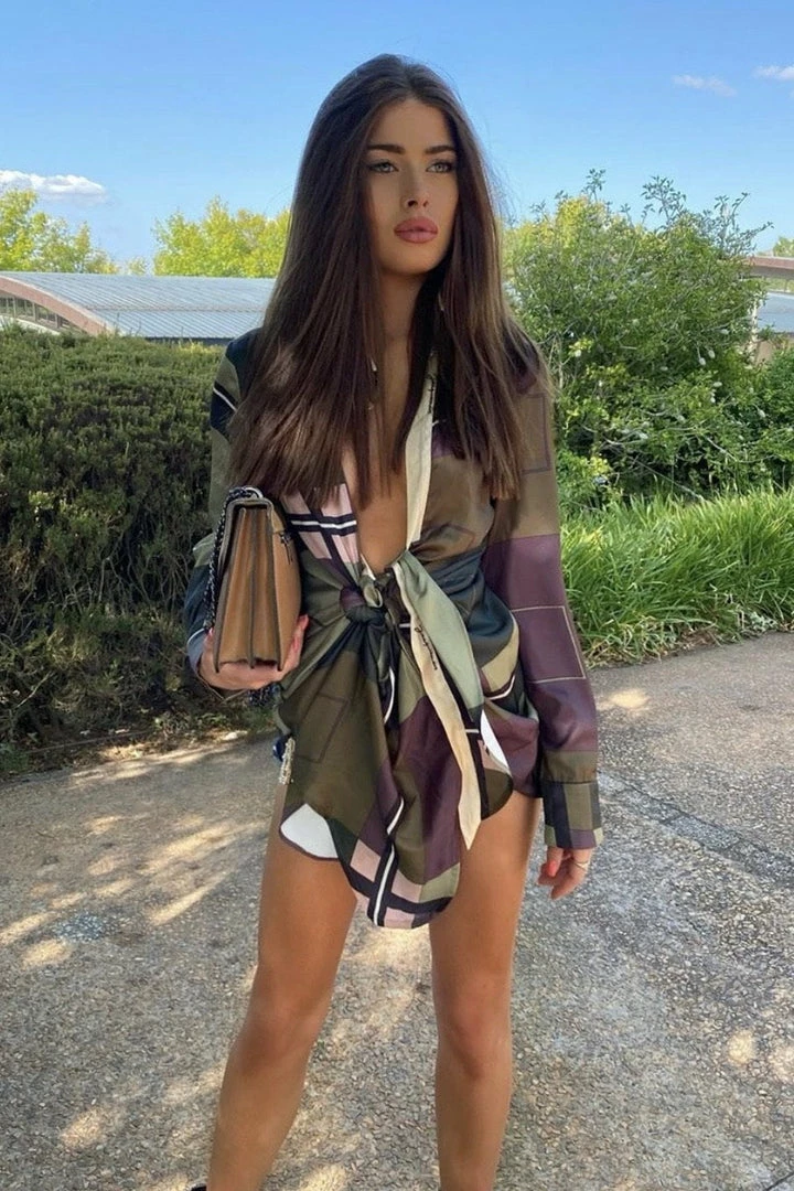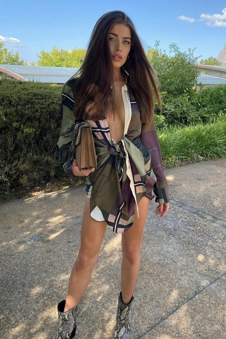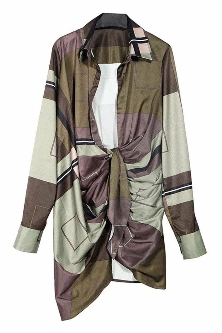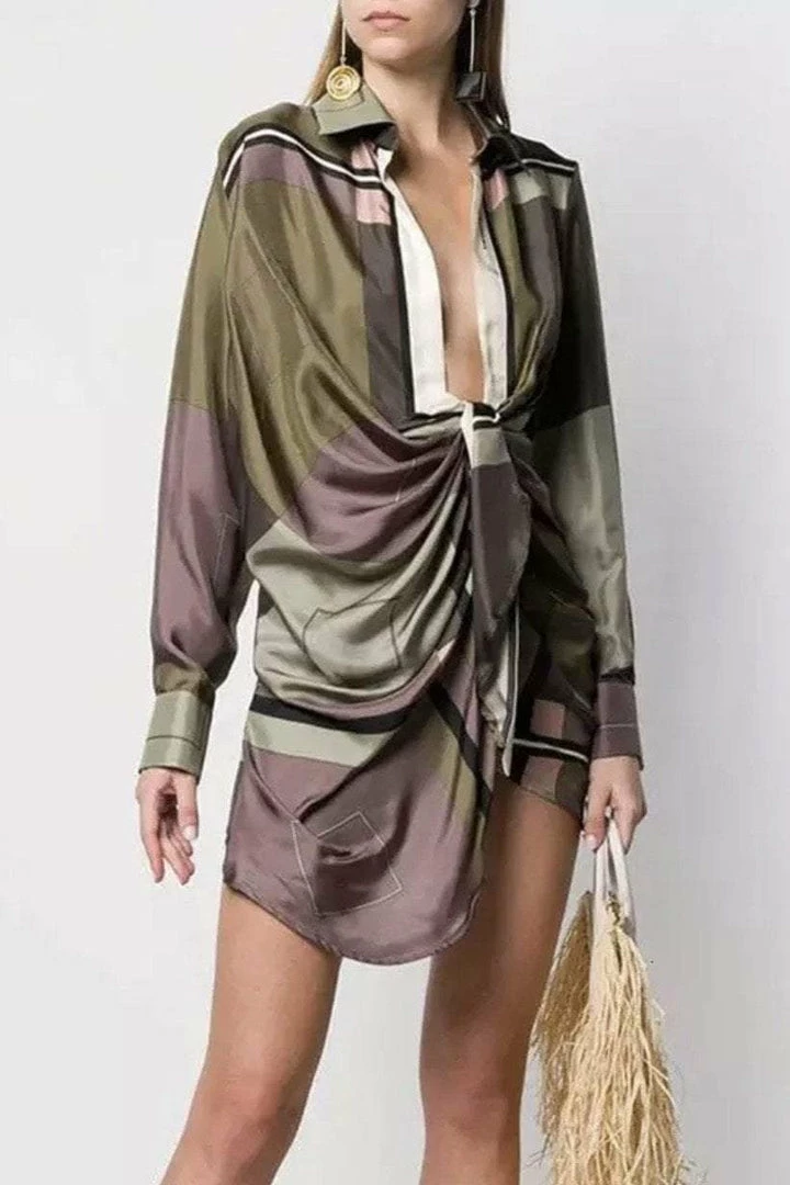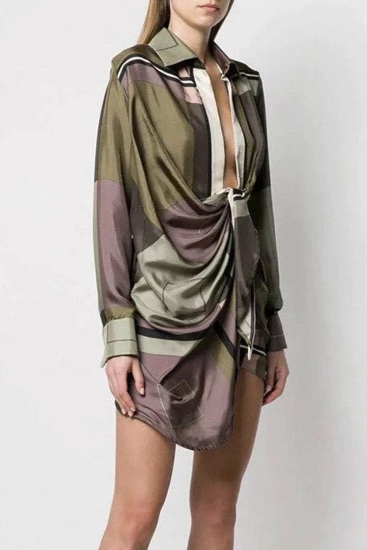 Have all eyes on you in this unique yet sexy piece. Featuring a geometric pattern material, long sleeves, deep v-neck, draped detail around the waist, and a mini length. Pair with stilettos and hoop earrings.