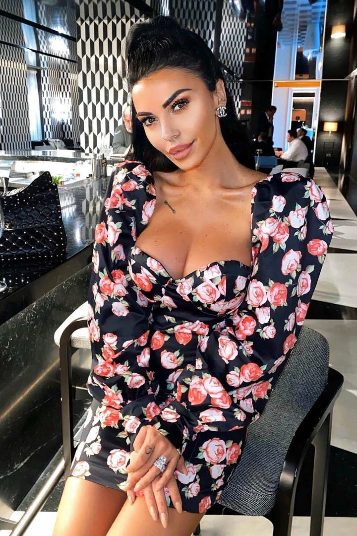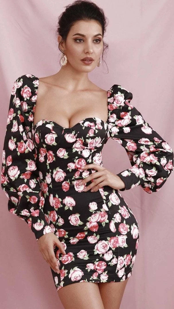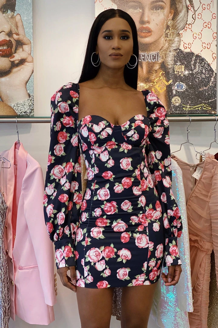 We are obsessing over all things floral and this dress is a serious statement. Featuring a black floral fabric with a sweat heart neckline and puff sleeves. Pair it with knee high boots and a leather jacket for the perfect day-to-night look.