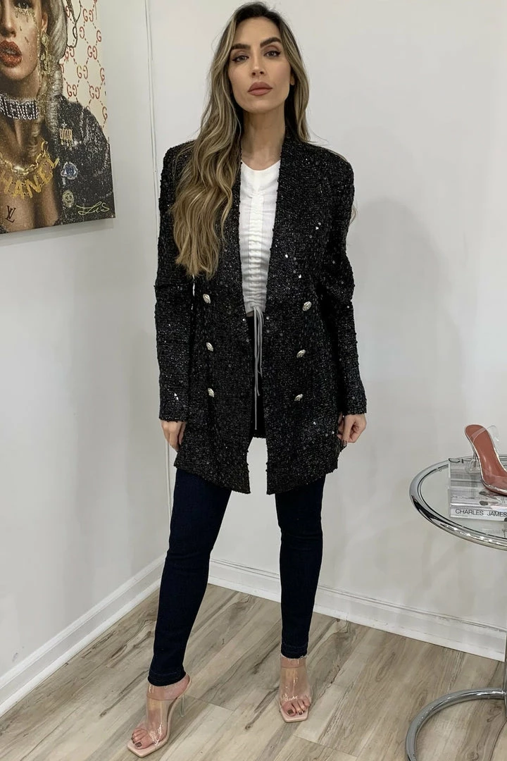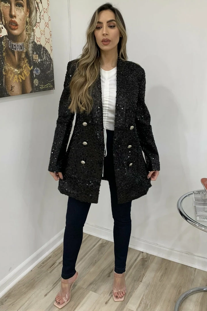 Black sequin blazer can we worn out on the town with pants as a jacket or as a dress, depending on how risque you are feeling.