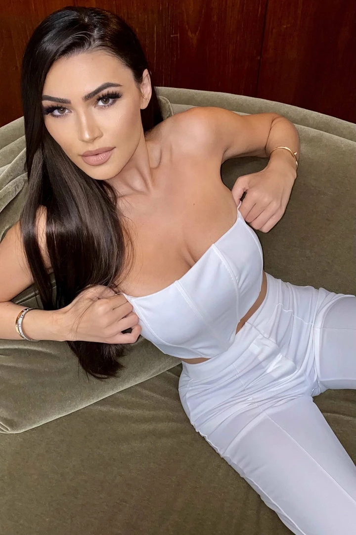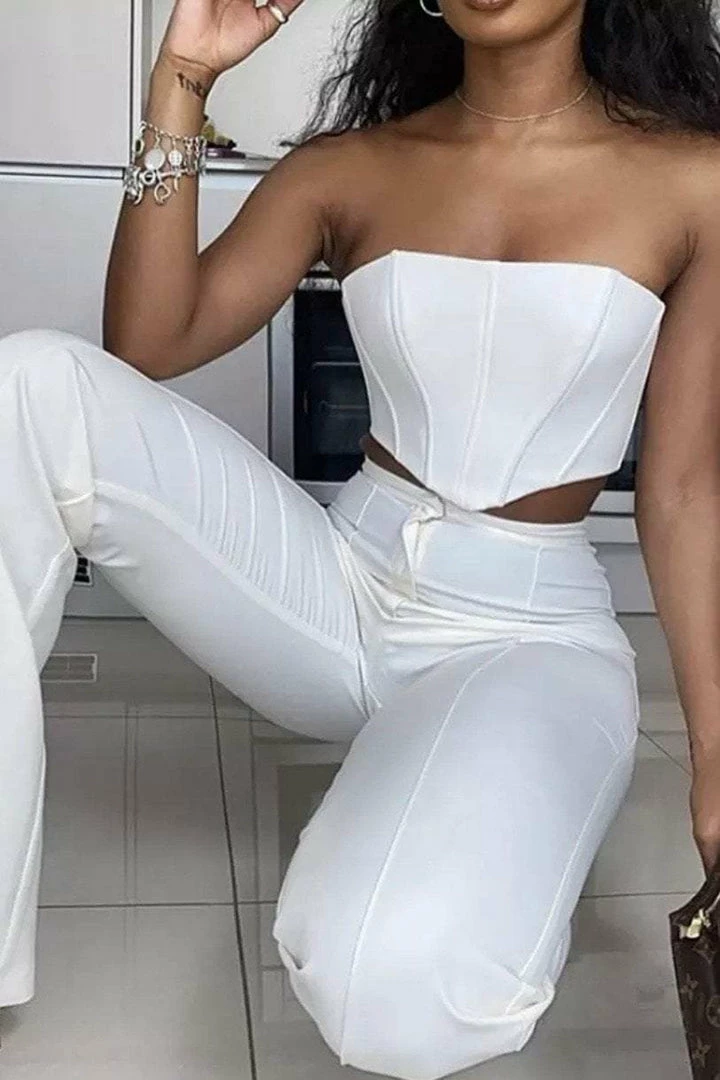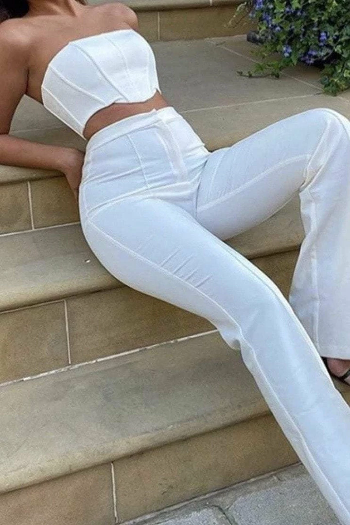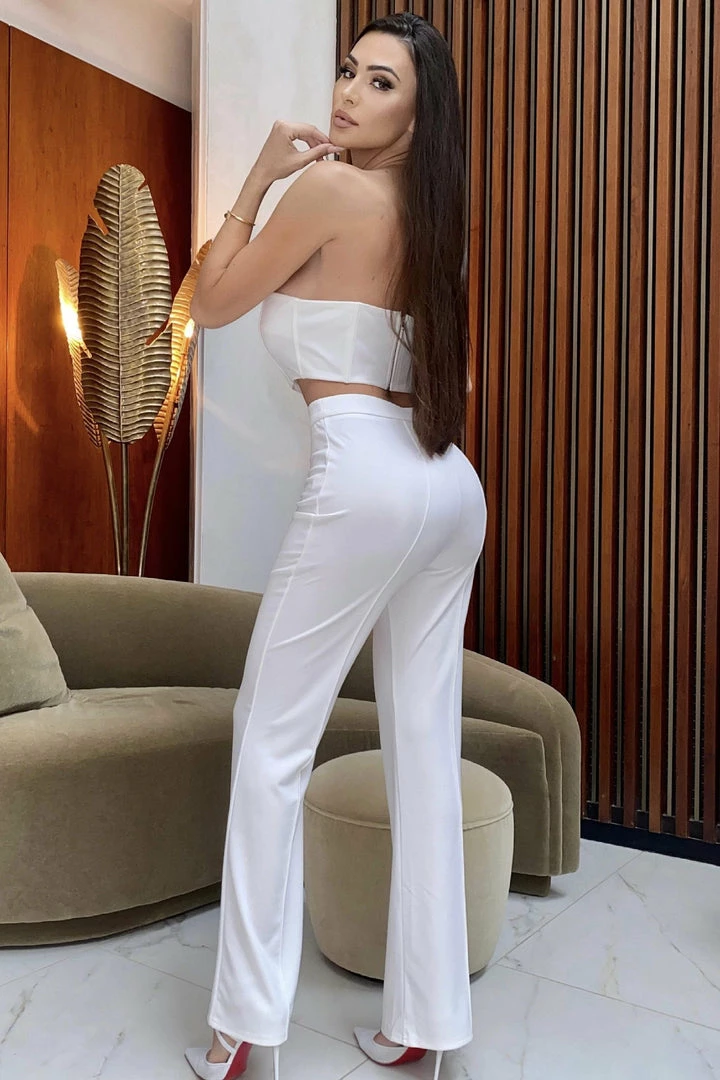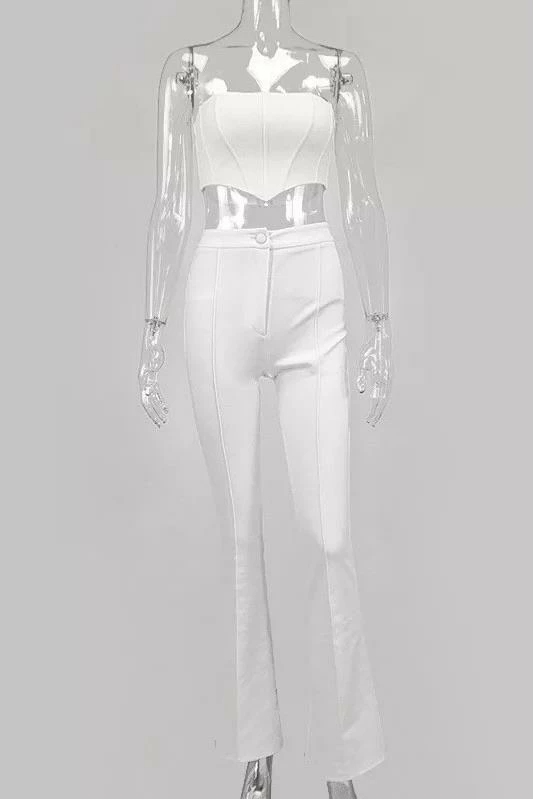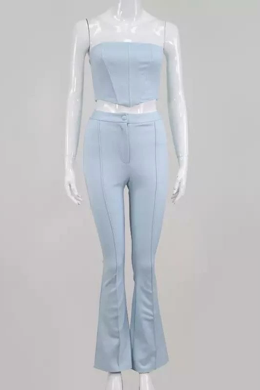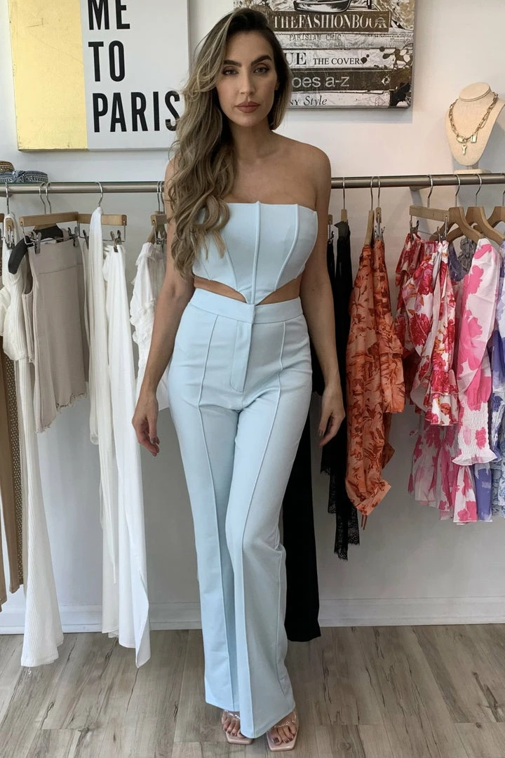 This super cute set includes a cropped bustier top with matching high waisted trousers. Pair with a mini handbag and heels for such a fun look!