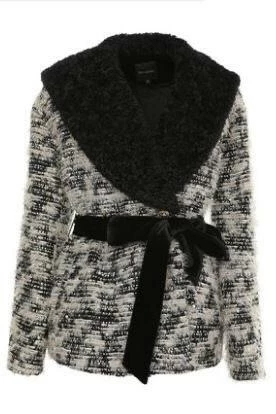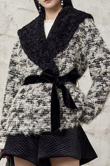 Beat the elements in serious style! This jacket features a tweed material with a fuzzy lapel, a velvet belt, and cut to a flattering short length. Add over any evening wear look this season!