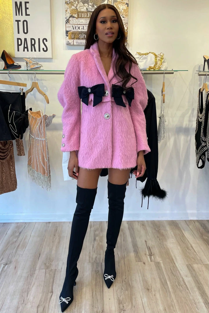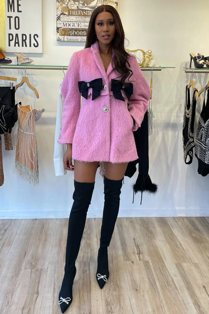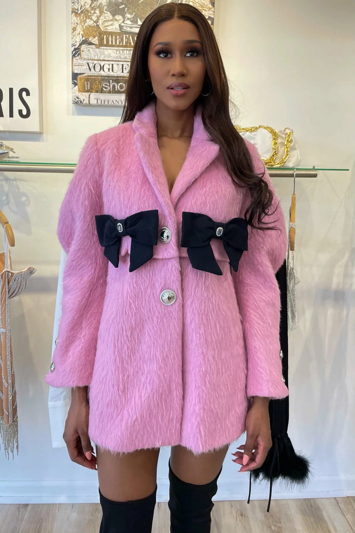 Combine both comfort and fashion with this bow detail jacket. Featuring silver buttons, double bow breast, and a wool material. Team it with jeans and booties for a killer off duty look!