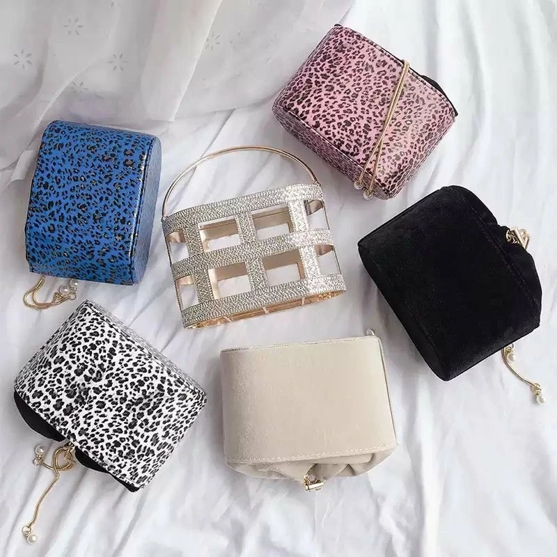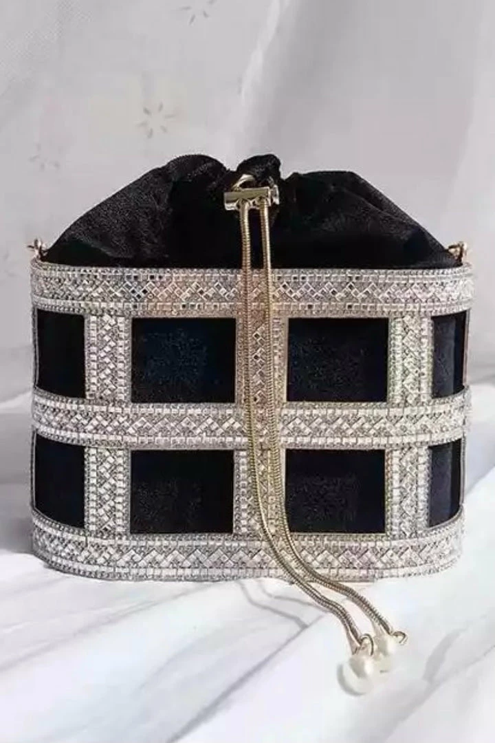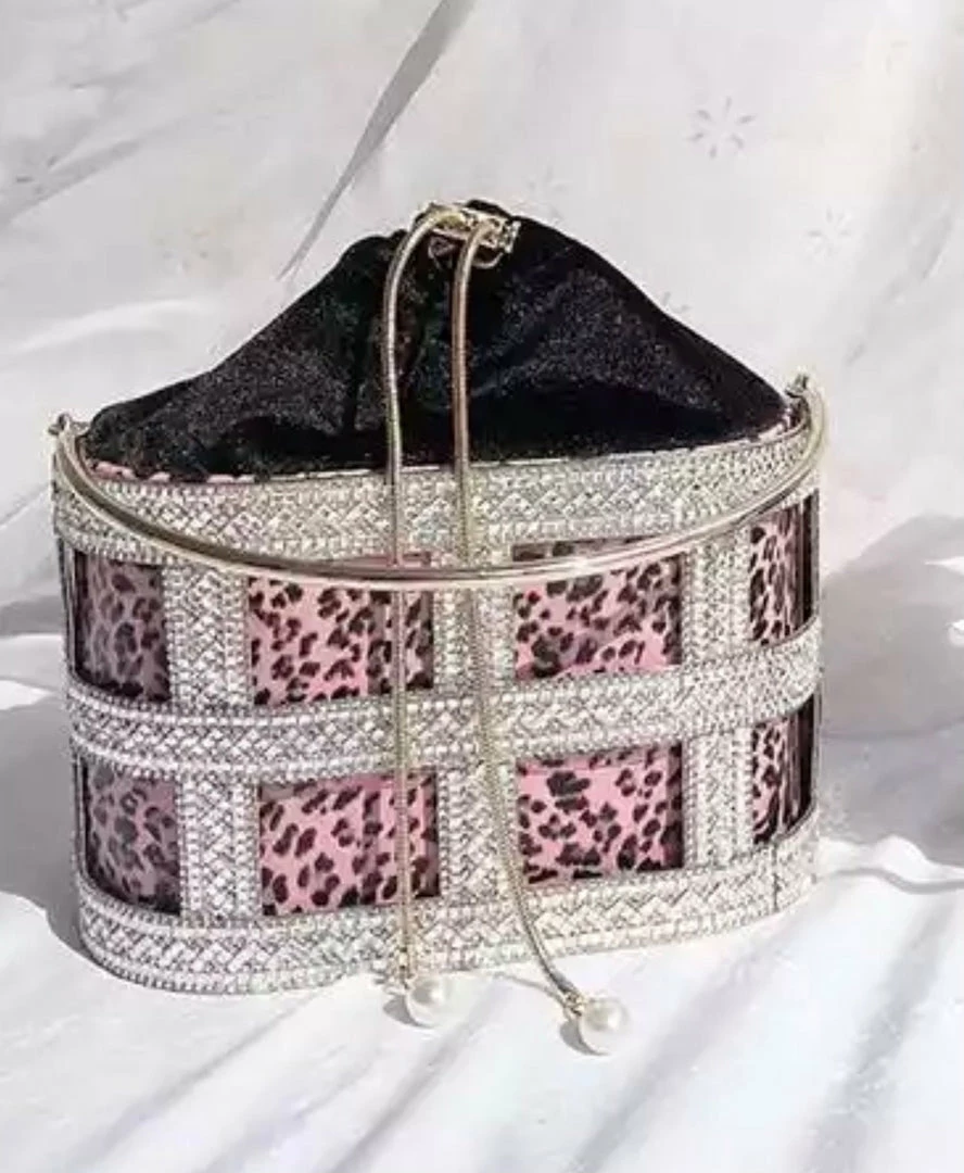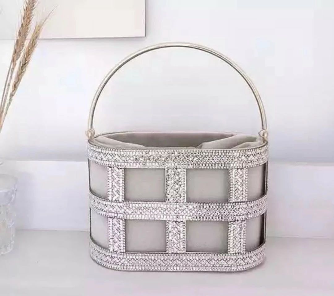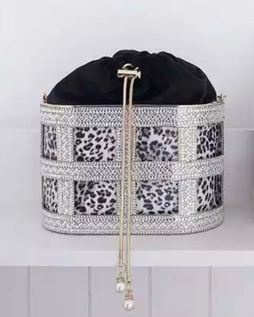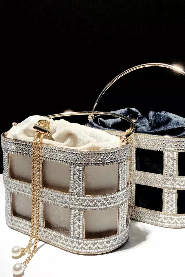 No look is complete without a glitzy clutch! Featuring a metal rhinestone bucket clutch with a roomy pearl drawstring case enclosure.