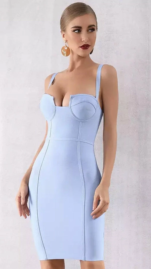 Add some flavor into your wardrobe with this icy blue dress. Including a mini length, spaghetti straps, and bodycon fit. Pair with statement earrings and high heels.