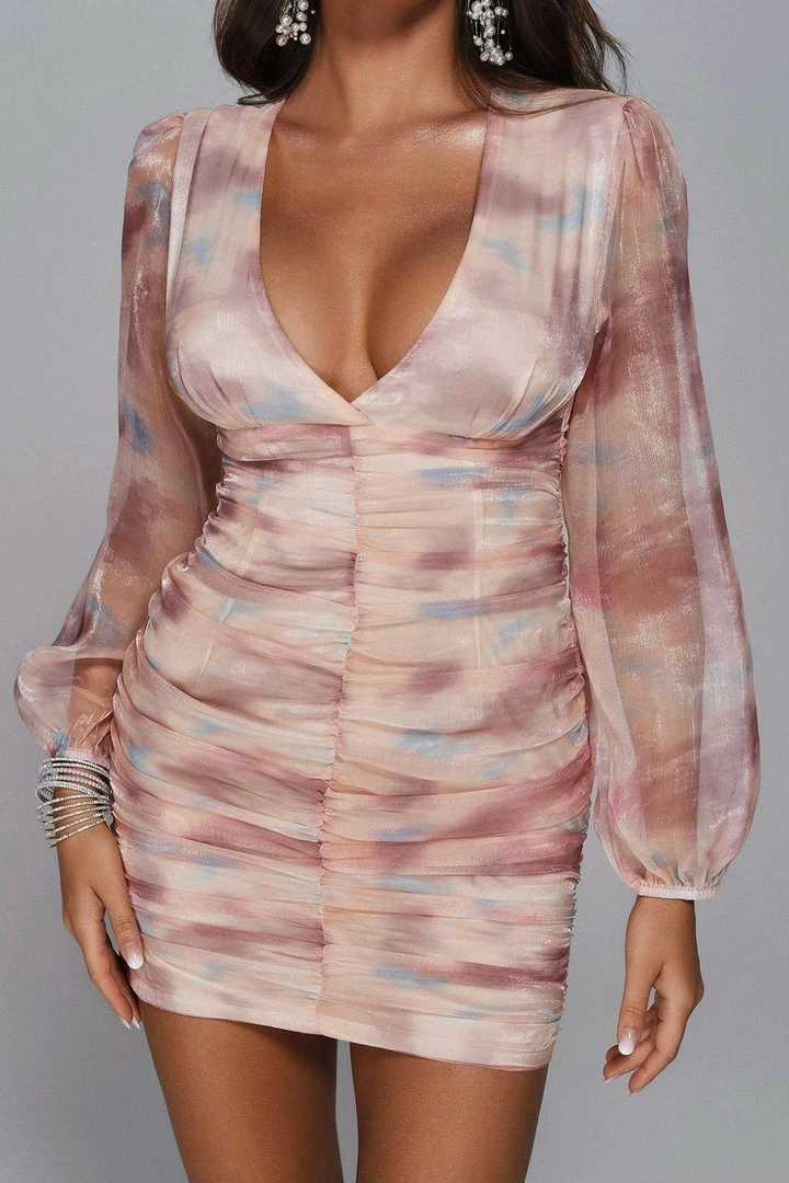 Perfect for your next brunch date, the ‘Amaranta’ dress features long sleeves, a v neckline, ruched detailing, bodycon fit, and a mini length. Pair with strappy heel sandals and gold accessories.