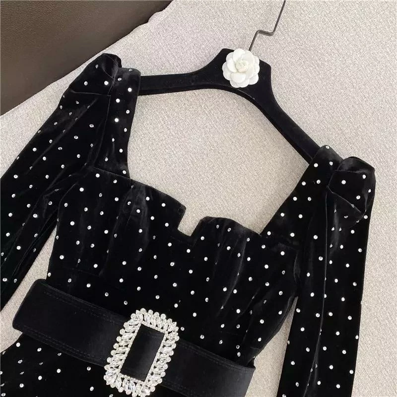 Serve glamour this season in this gorgeous mini with long sleeves, a square collar, diamond decorations, an attachable waist belt, and a velvet material. Wear with black ankle strap heels and your hair pinned up for a look we are loving.