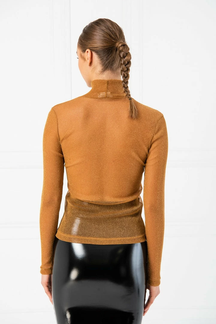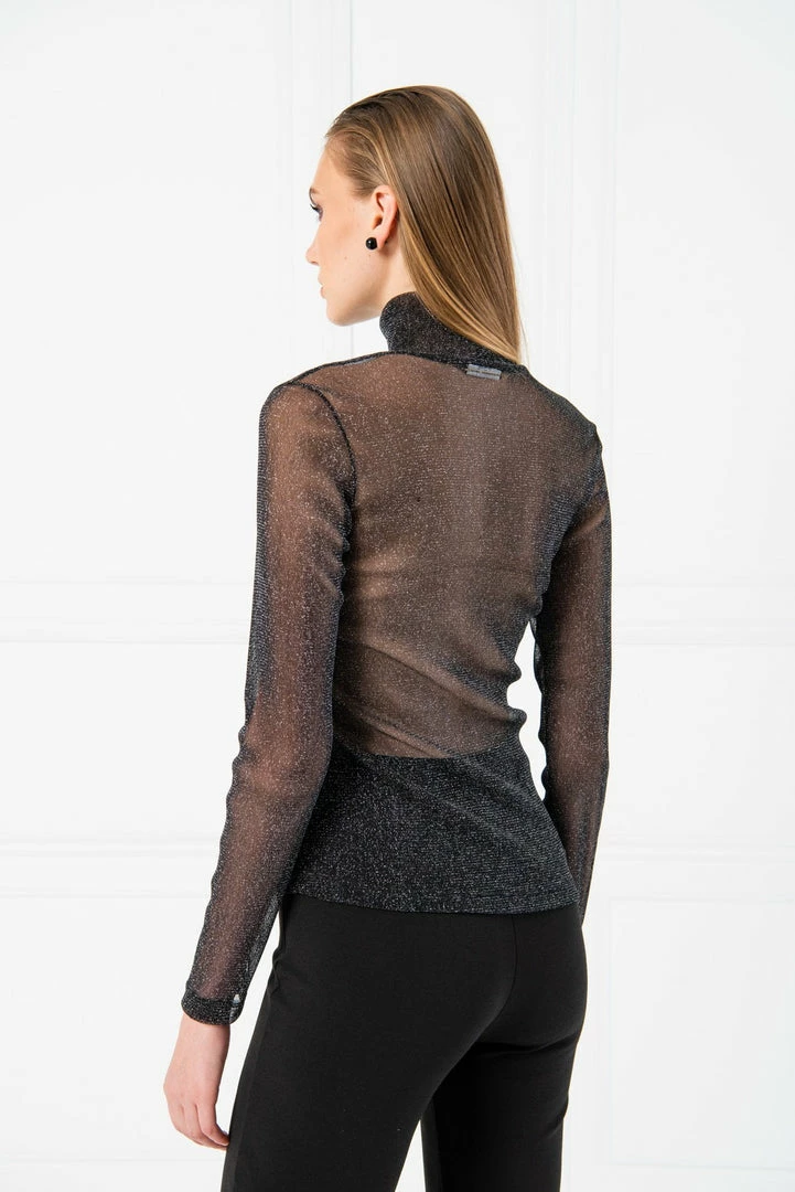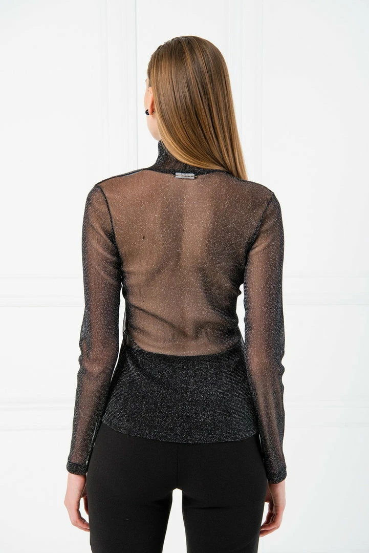 Finish off the look with this sheer mesh top. Featuring a black and silvery sheer mesh material with a high neckline and long sleeves. Pair it with patent leather leggings and heels for a night out!