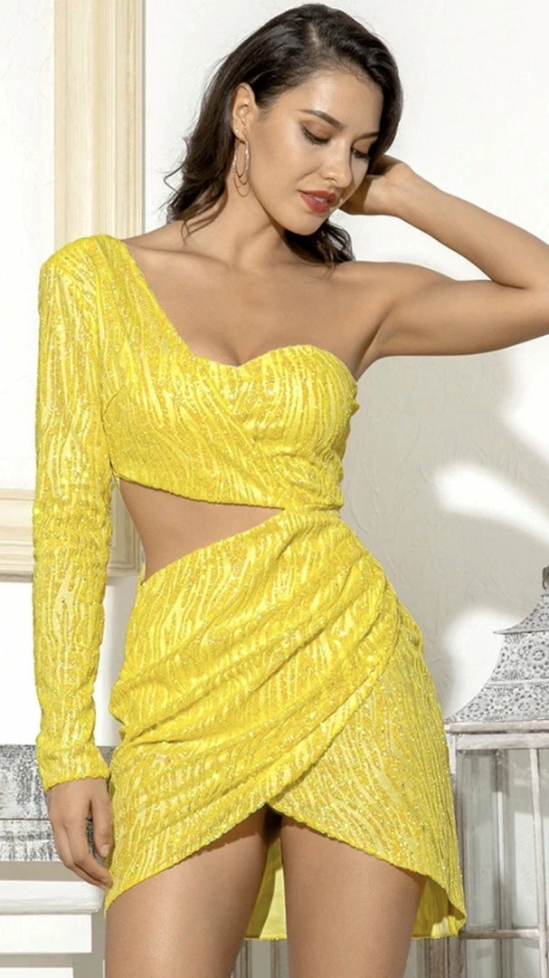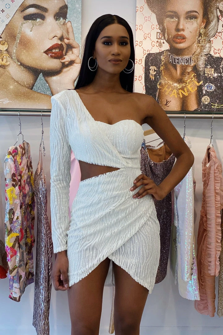 This Jessica Bara is a sexy cut out with single sleeve. It contains glitter glue beaded material. Amazing party dress!