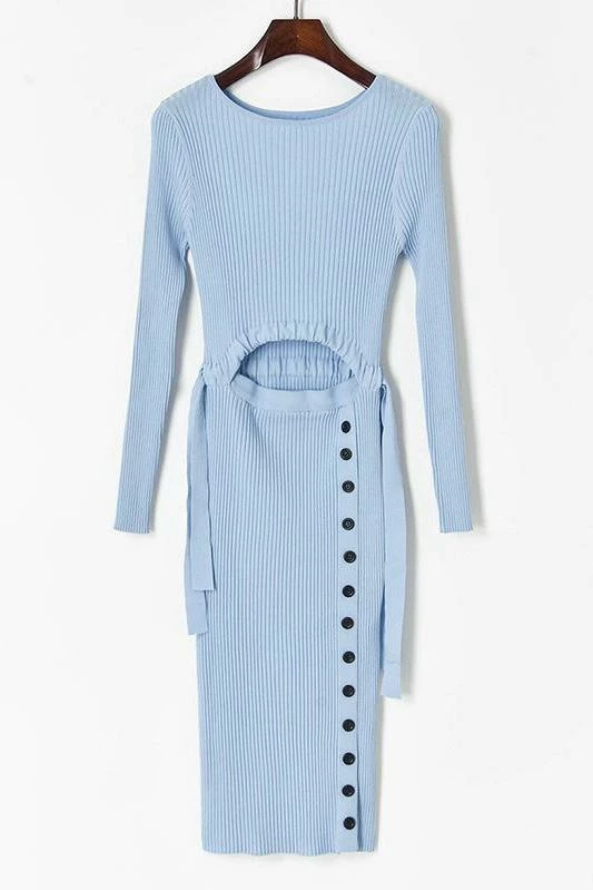 Become casually cute in this knitted maxi dress with buttons along the leg slit and a midriff cut out. Dress comes in options of short or long sleeves. Pair with a denim jacket and ankle booties for an unstoppable look this autmn.