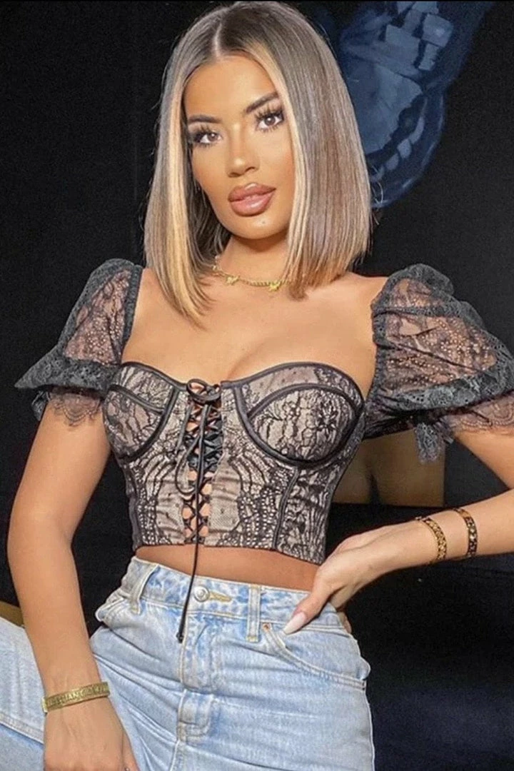 Look super sexy at your next night out in the top! Featuring a lace material, short sleeves, bustier style, lace up detail, and a cropped length. Pair with leather leggings and booties for a killer look.