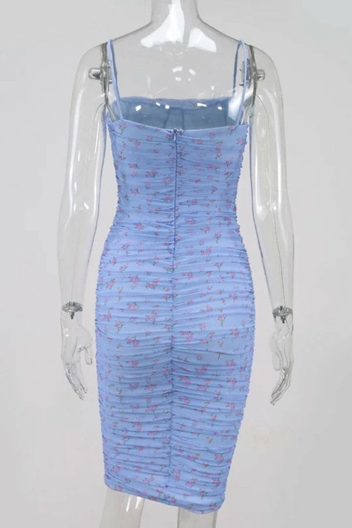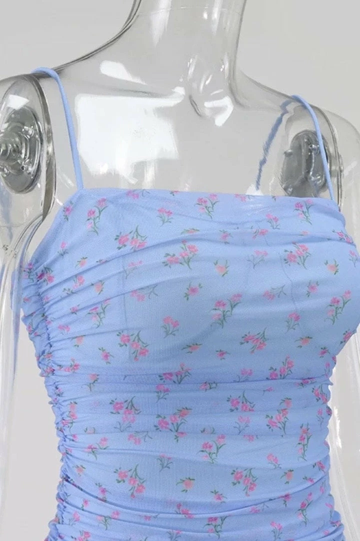 Add some florals into your new season wardrobe with this midi dress! Featuring a floral printed material, spaghetti straps, ruching all over, and a mesh overlay. Pair with heels and simple accessories for a look everyone will obsess over.