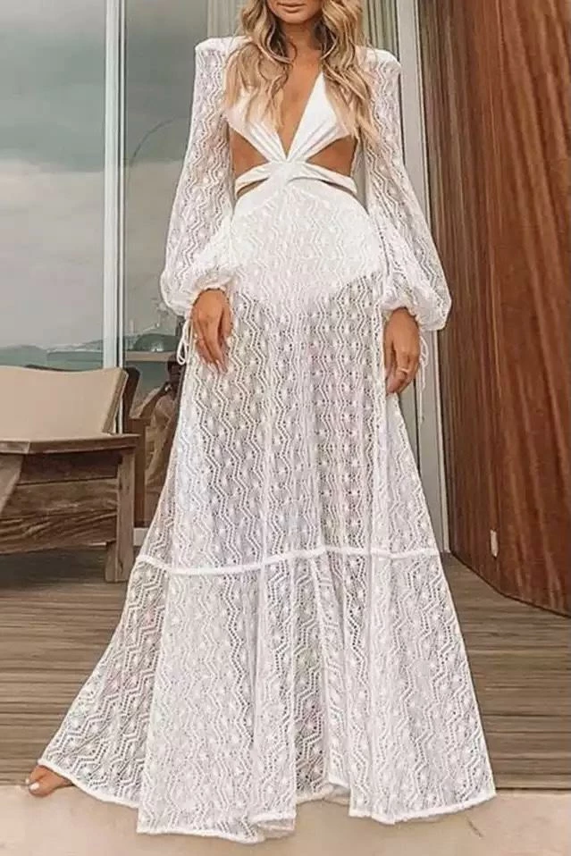 Serve beach side beauty this summer in this maxi flowy cover up! Featuring long lantern sleeves, midriff cut outs, plunging v neck, and a crystal neckline with a crystal fringe waist hem. Pair with a big floppy hat and black sandals for a look we are loving!
