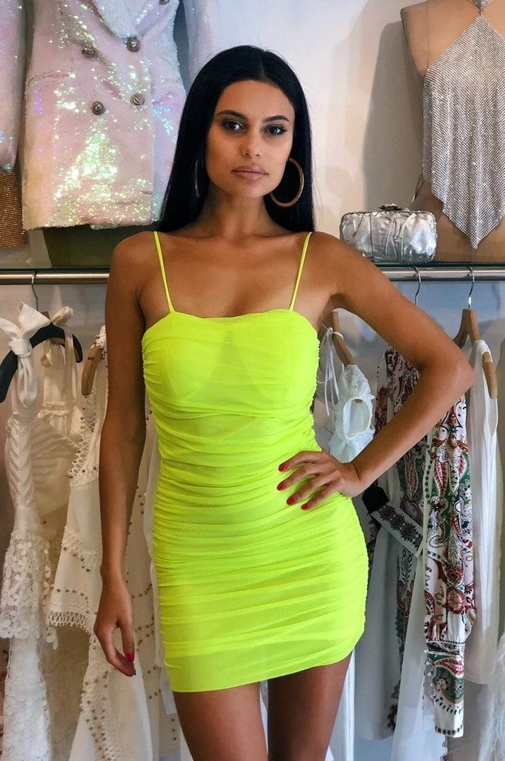 Be prepared to catch eyes in this body-hugging number. Including a bodycon fit, spaghetti straps, ruching, and a mini length. Pair with strappy heels for a killer look.