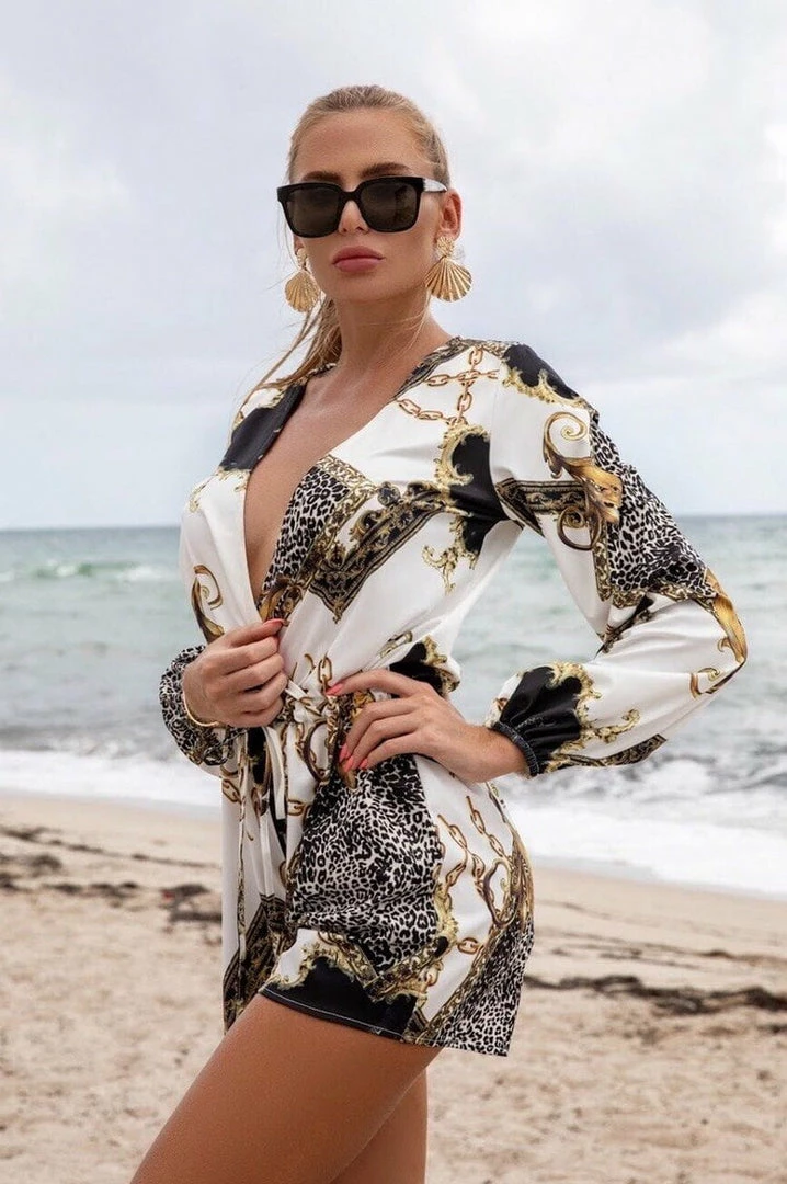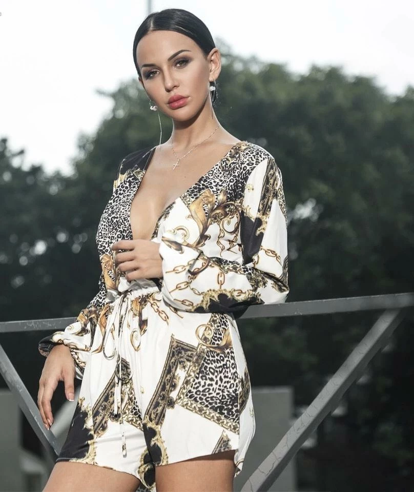 This Jessica Bara Aria Long Sleeve V Neckline Playsuit is an elegant fit for any occasion. Length hits right above knee. Has a regular fit. Made up of Polyester.