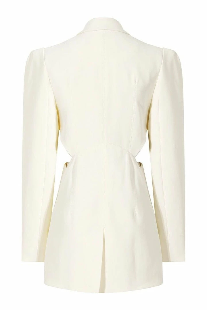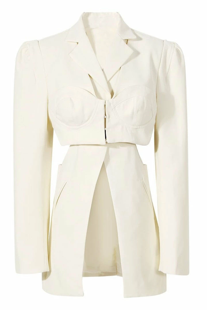 Serve a work look they won’t forget. Featuring a long sleeve blazer with two side cut outs, a bust outline, hook and eye front enclosures, and a split open waist skirt hem. Pair with cigarette trousers and booties for a combo we’re obsessing over.
