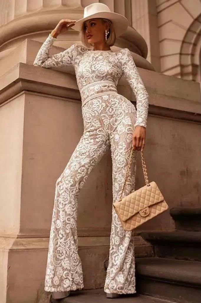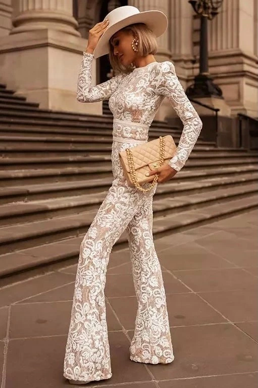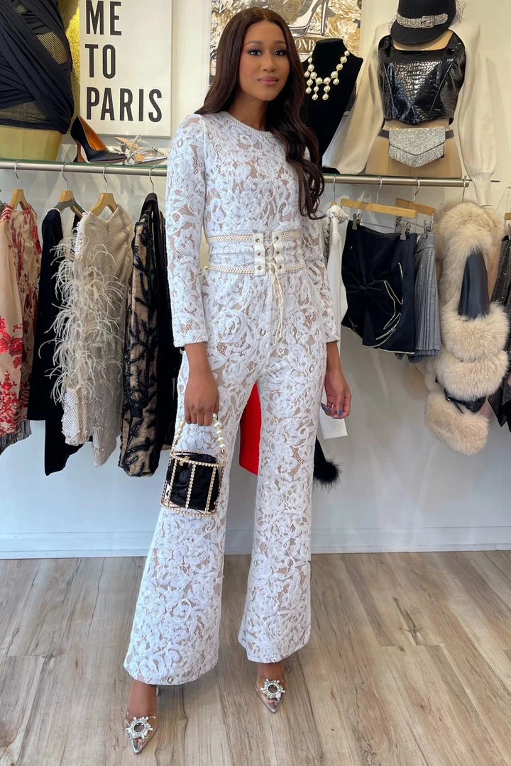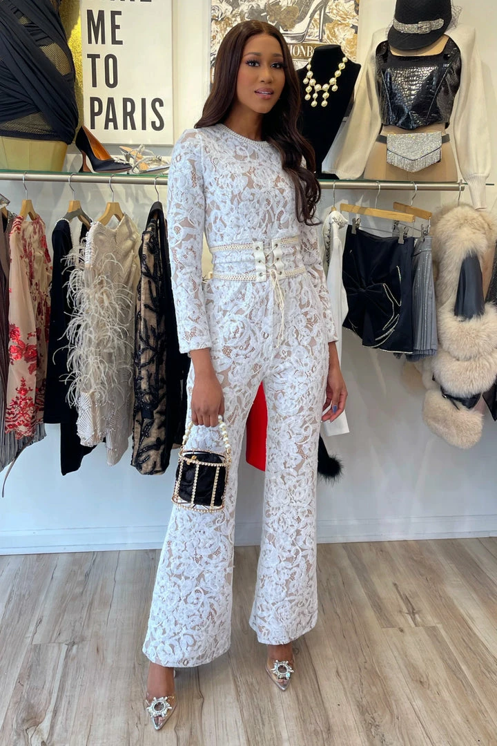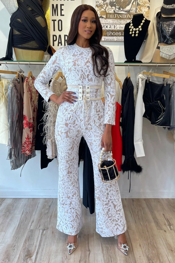 Go full glam this season dolls! This stunning jumpsuit features a bandage material, an intricate lace and sequin design, and long sleeves. Add pumps and a clutch for an unforgettable look at your next special event!