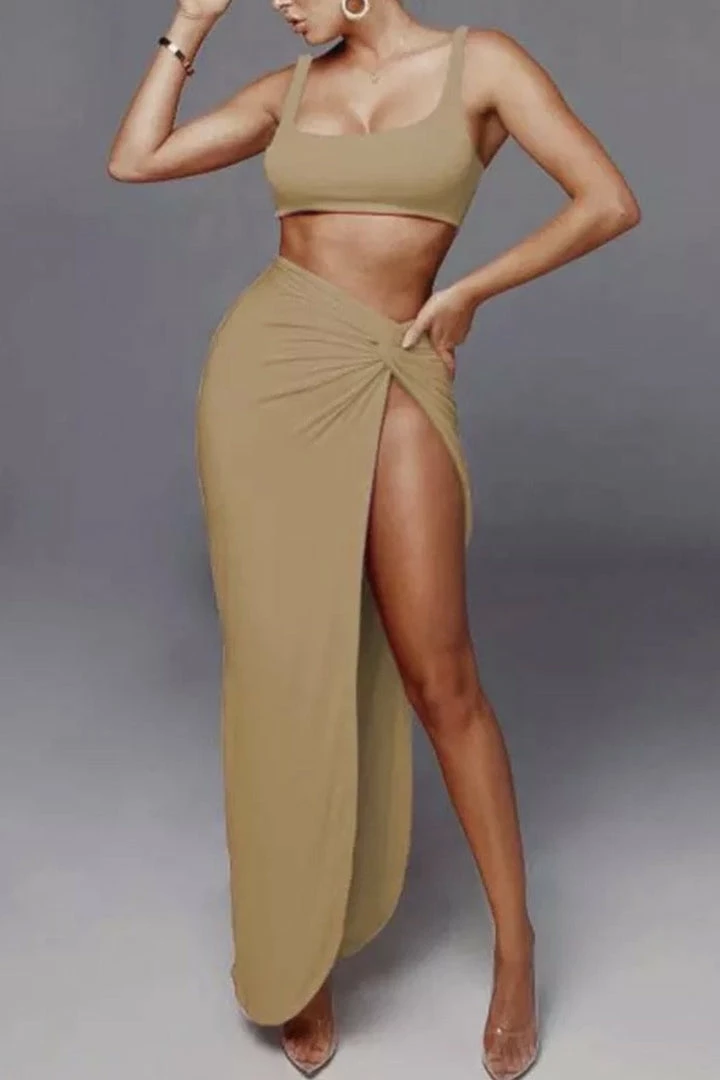 Show off your curves in this sexy two piece set. Comes with a square neckline crop top and a maxi skirt with a high leg slit, knotted detail, and high waisted fit. Team this with clear heels and big hoop earrings for a summer look that’s sure to kill.