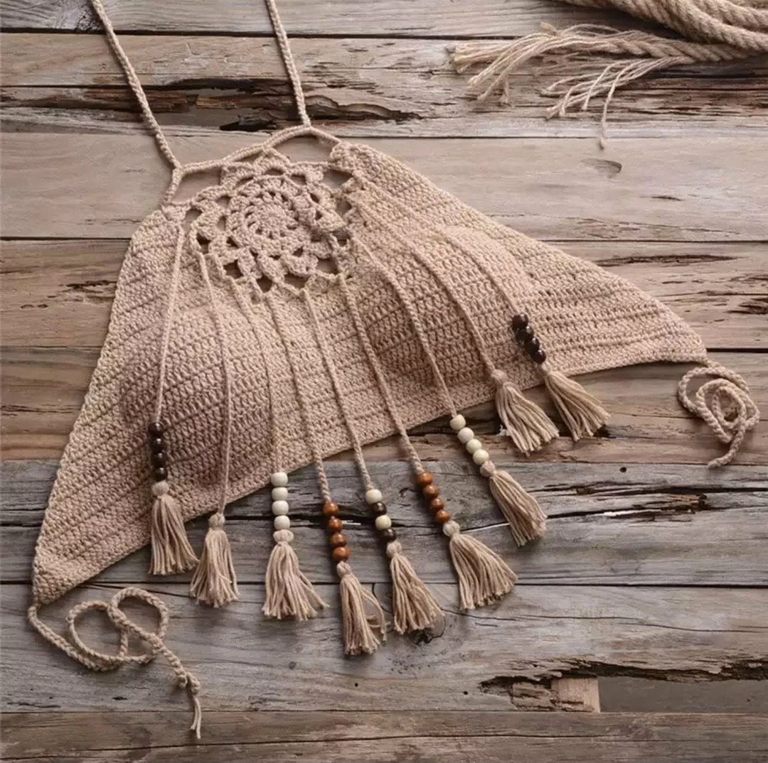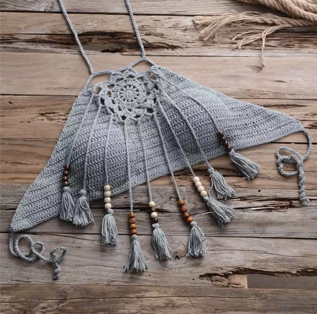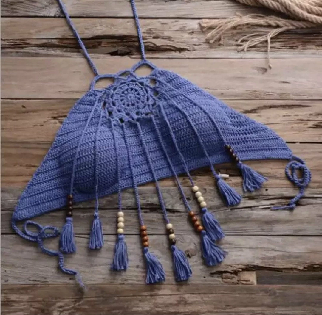 This crochet set is a summer essential dolls. Featuring a halter neck top with a handmade flower design, suspending tassels with beads, and matching high waisted bottoms. Grab your beach bag babes because summer is coming!