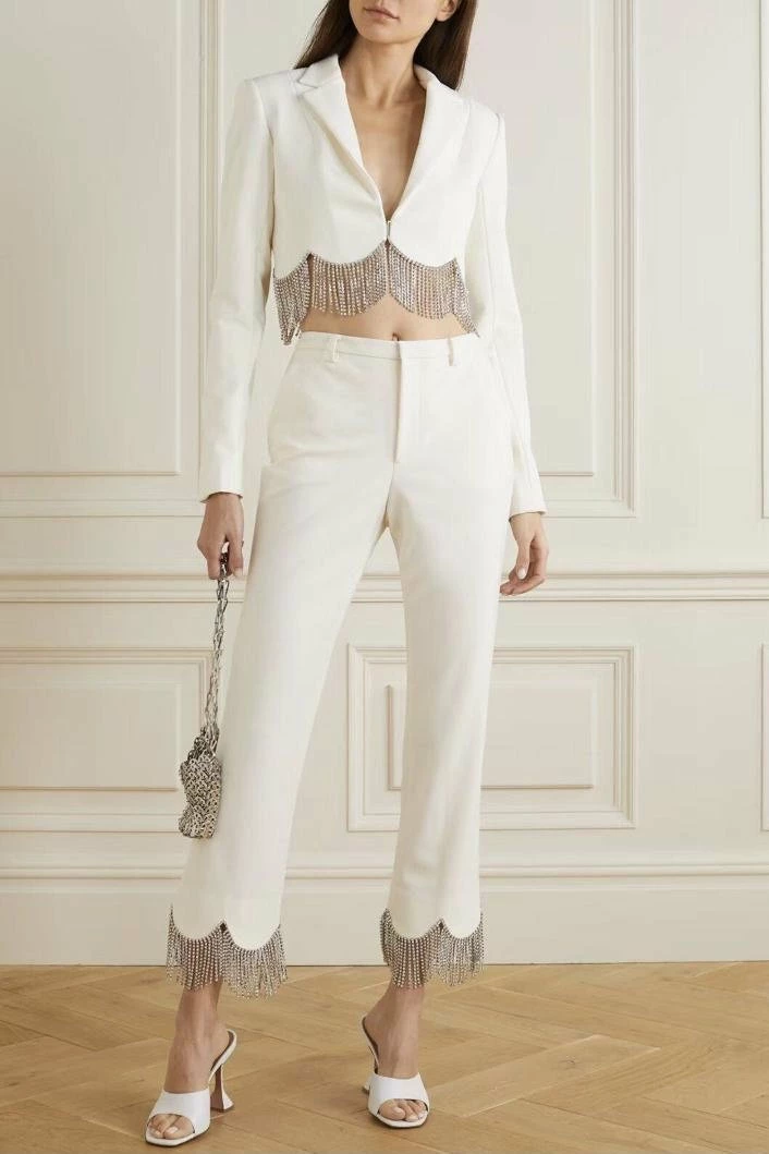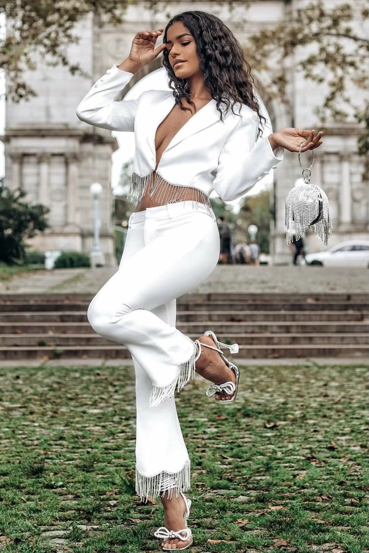 Feel yourself in fringe with this stunning two piece set that features a long sleeve fringe blazer and a matching pant with fringe leg cuffs.