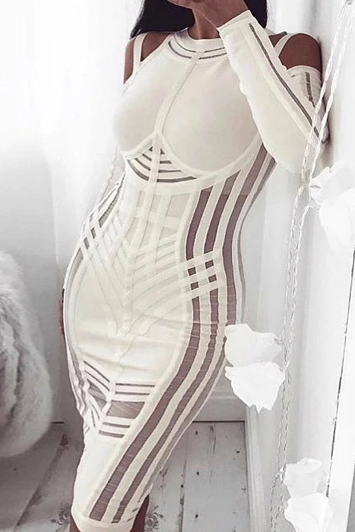 Have all eyes on you in our ‘Becca’ midi! Featuring a white bandage material, long sleeves, cut-outs on the shoulders, sheer details all over, bodycon fit, and a midi length. Pair with strappy heels and a red lip.