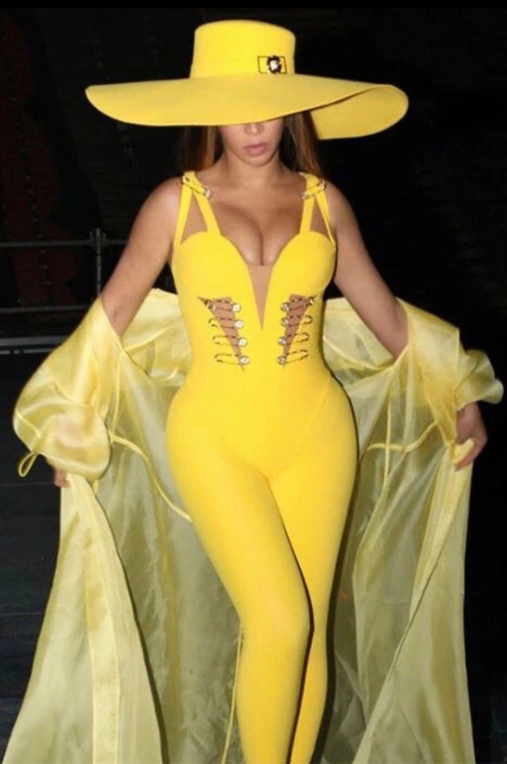 We are so in love with this fierce jumpsuit! Featuring a bandage fit, v-neck detail, grommets, and tailored legs.
