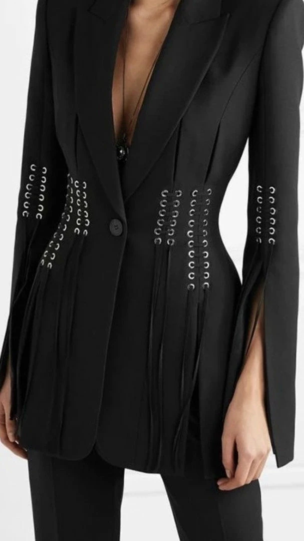 Reach this season’s fashion goals by getting our ‘Bethany’ blazer. With slits on the arms and back, v-neck detail, and lace up details all over.