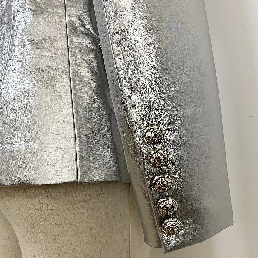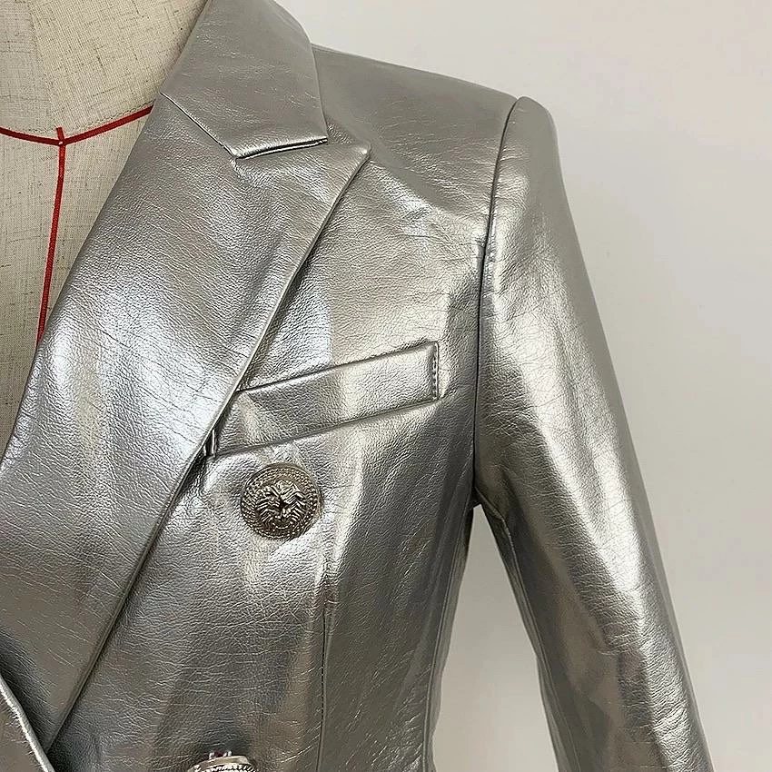 Turn heads from the AM to the PM in our ‘Bonnie’ Blazer. This super cute style features a metallic silver color, faux leather, cotton blend polyester material, and a double breasted style.