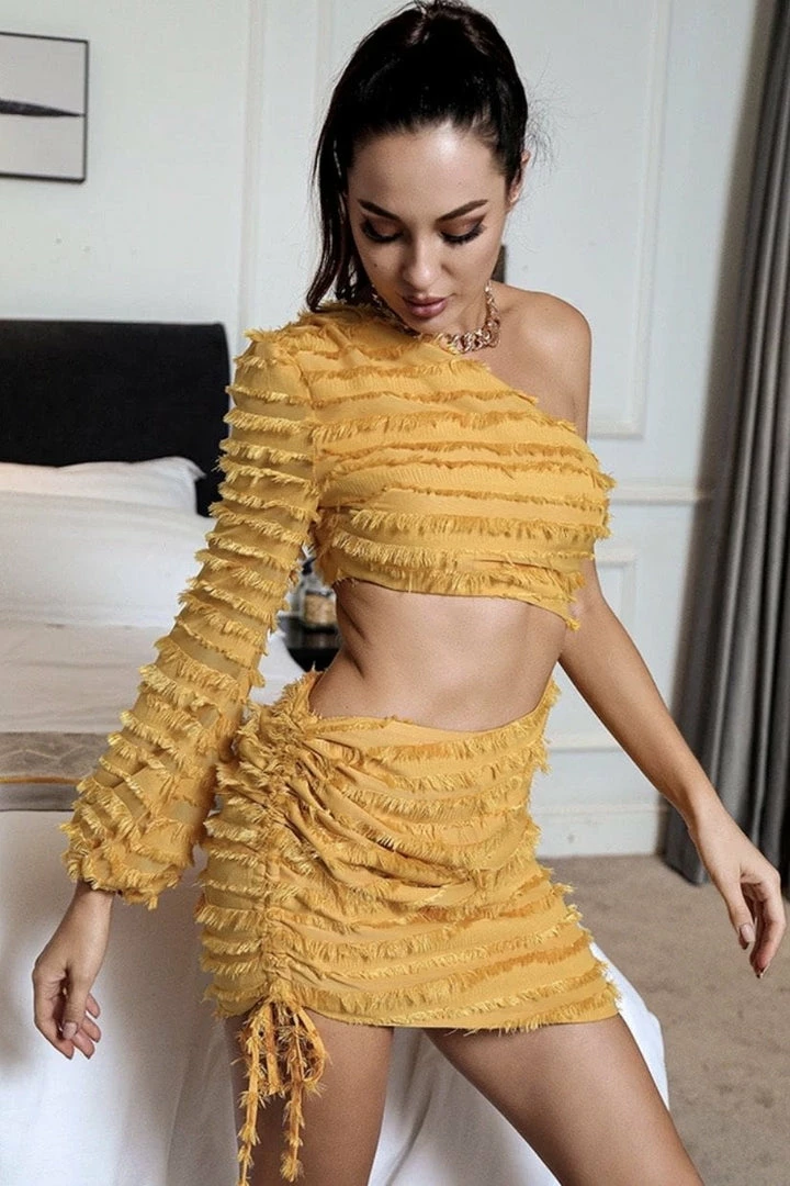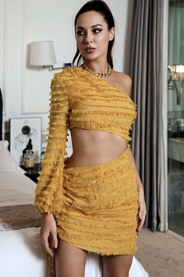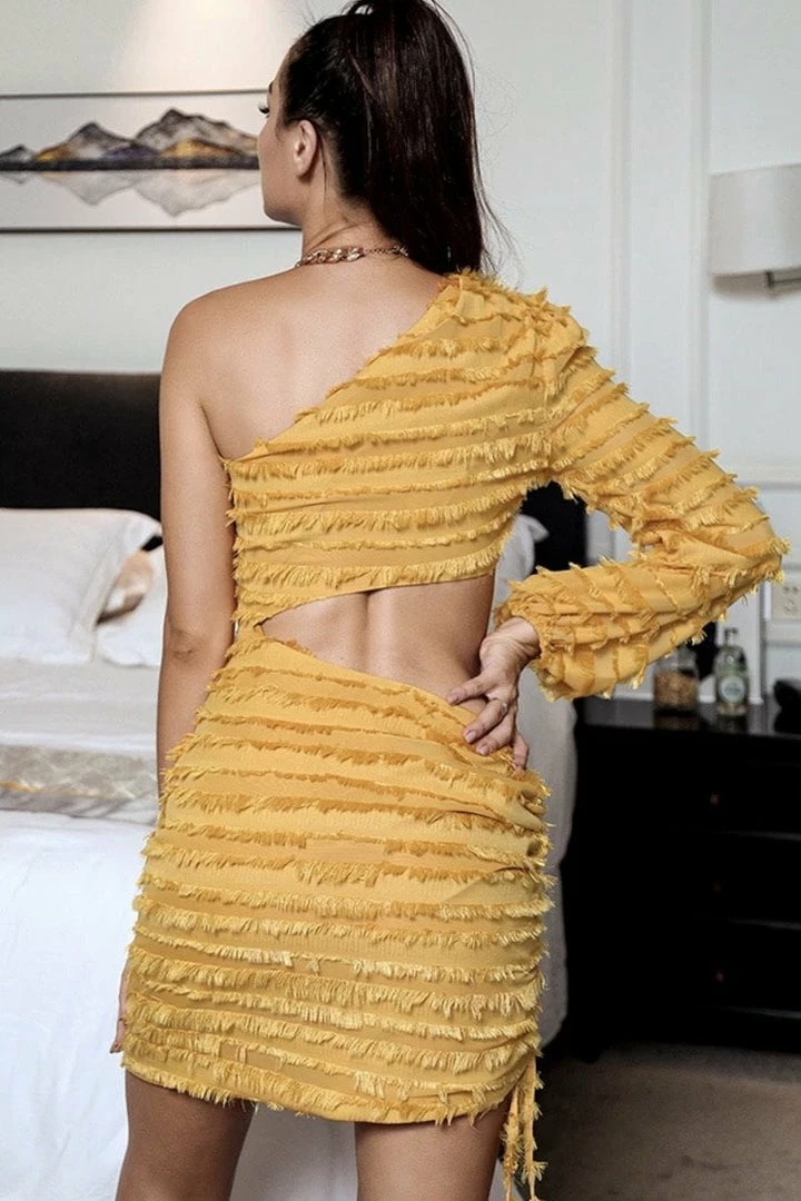 Featuring a one shoulder style, waist cut out, fringe detail all over, bodycon fit, and a mini length. This piece is a show stopper! Complete the look with a high ponytail and nude heels.