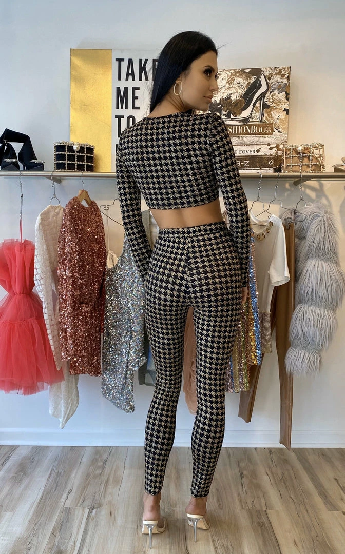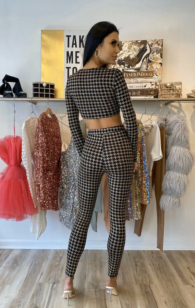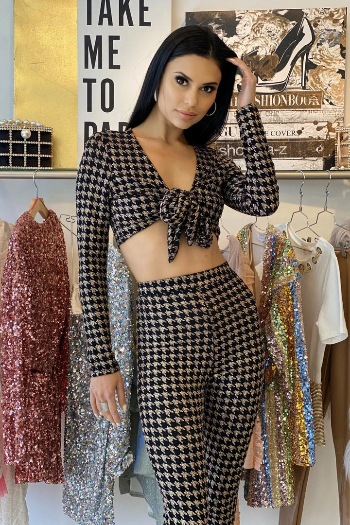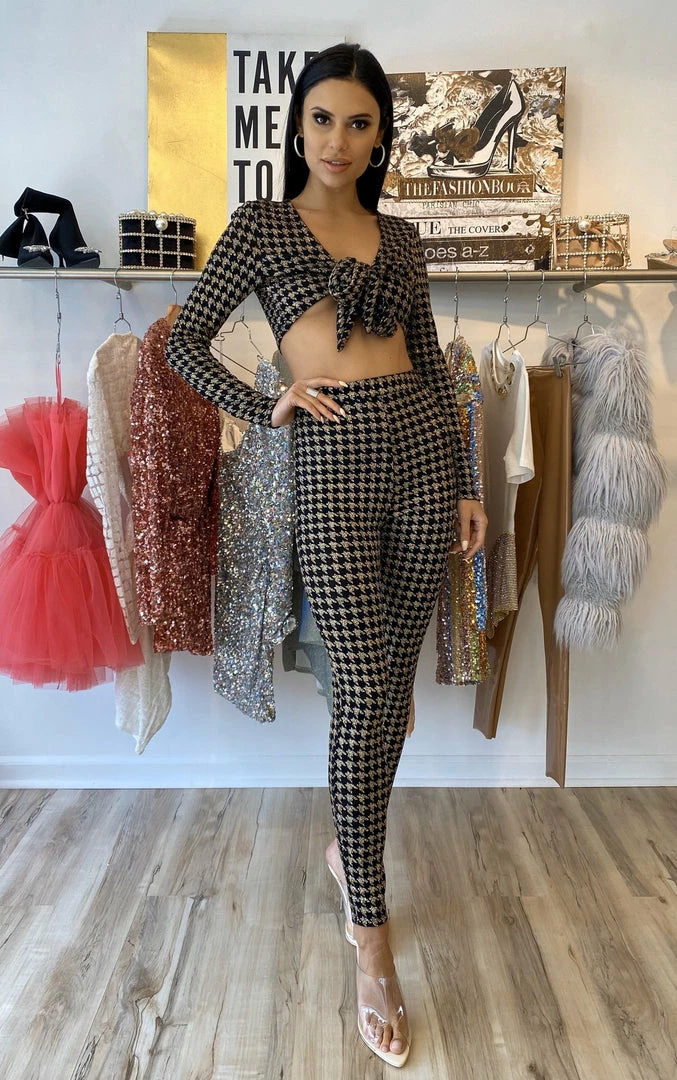 Taking the houndstooth print to a whole other level, our ‘Breann’ two piece set will have you feeling sexy yet comfortable. Featuring a gold and black houndstooth material, long sleeve crop top with adjustable bow, and high-waisted matching bottoms. Pair with black heels and gold accessories.