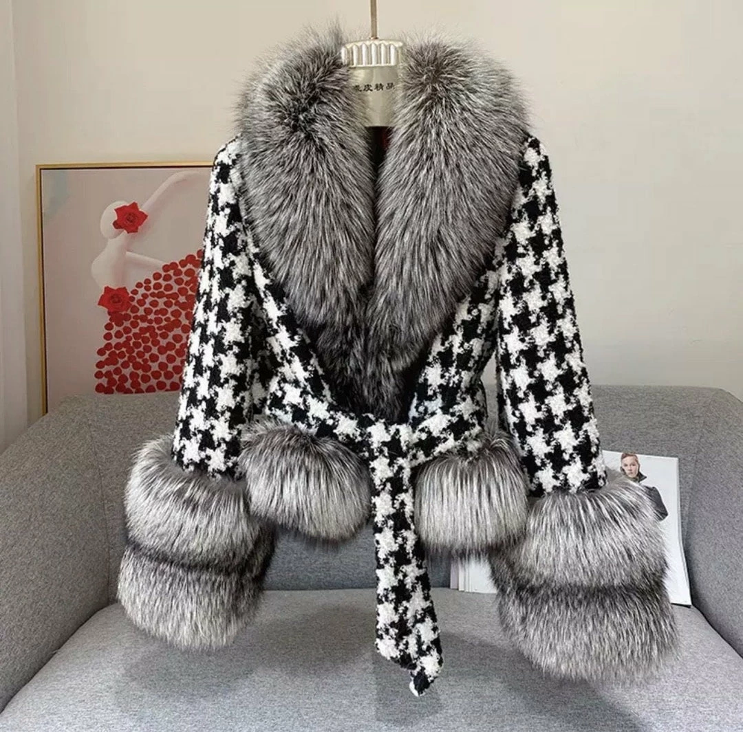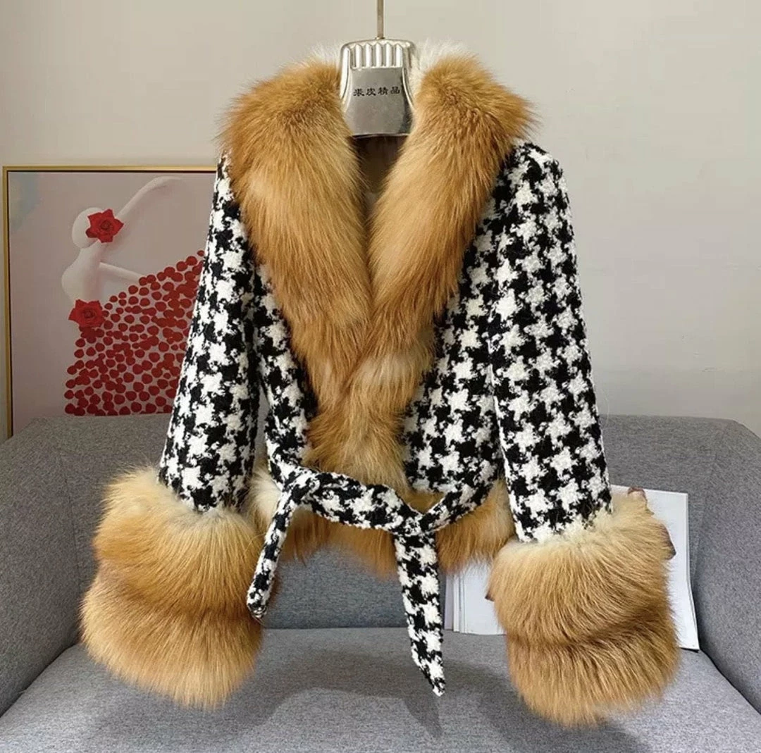 We are crushing on this jacket for the new season! Featuring a houndstooth material, fox fur trim, and a belted waist. Team this with jeans and fresh kicks for a shopping date with the dolls.