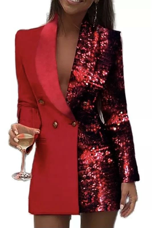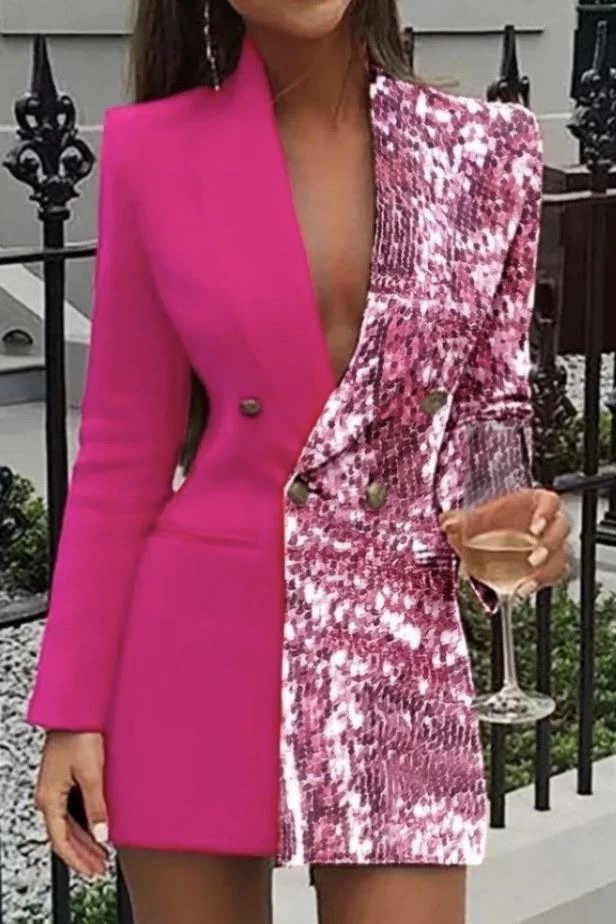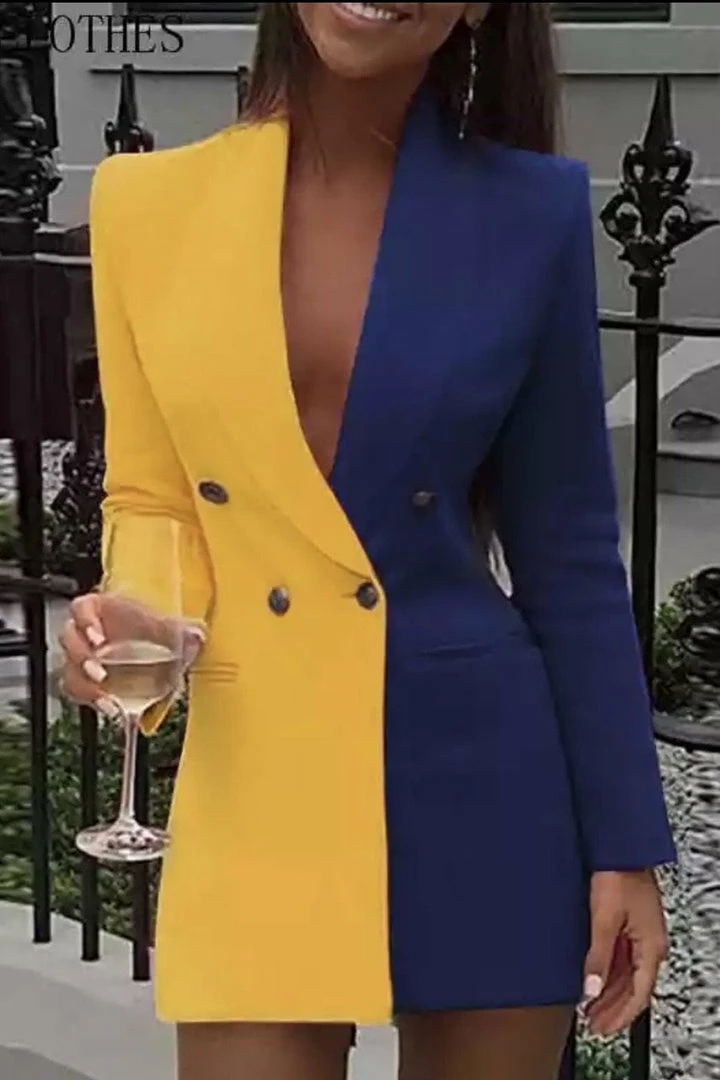 Be the best dressed at your next event in this stunning long sleeve blazer with a plunging v neck, button enclosures, and color block colors split right down the middle. Size up to style as a blazer dress and pair with pumps and a mini clutch for a look that no one will forget.