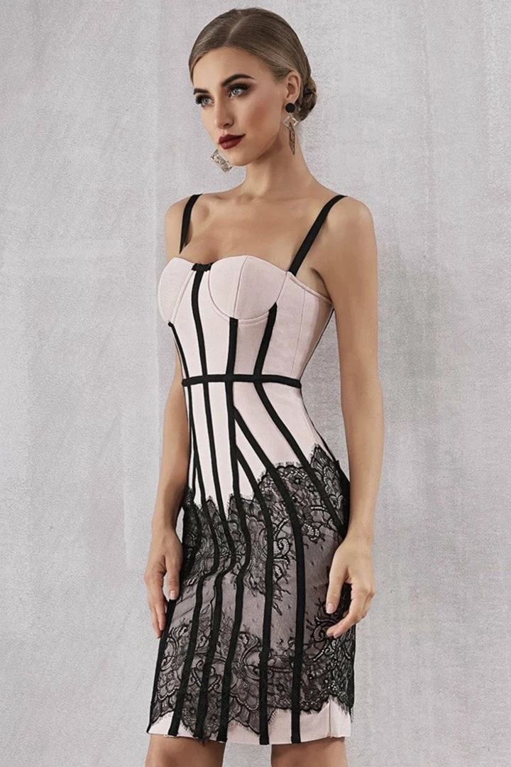 Have every person in the room drooling over you in our ‘Caleigh’ dress! Featuring a bandage material, corset and lace detailing, spaghetti straps, bodycon fit, and a midi length. Pair with strappy black heels.