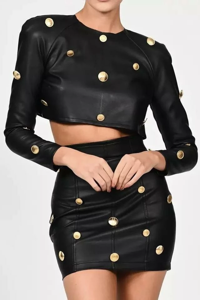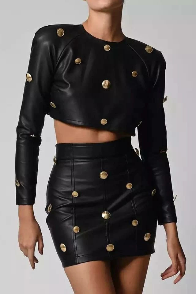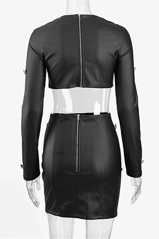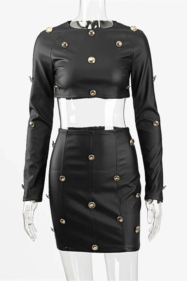 This leather two piece set includes a crop long sleeve top and high waisted skirt that hugs your figure. The gold buttons scattered throughout this set is an adorable detail that is sure to make a statement!